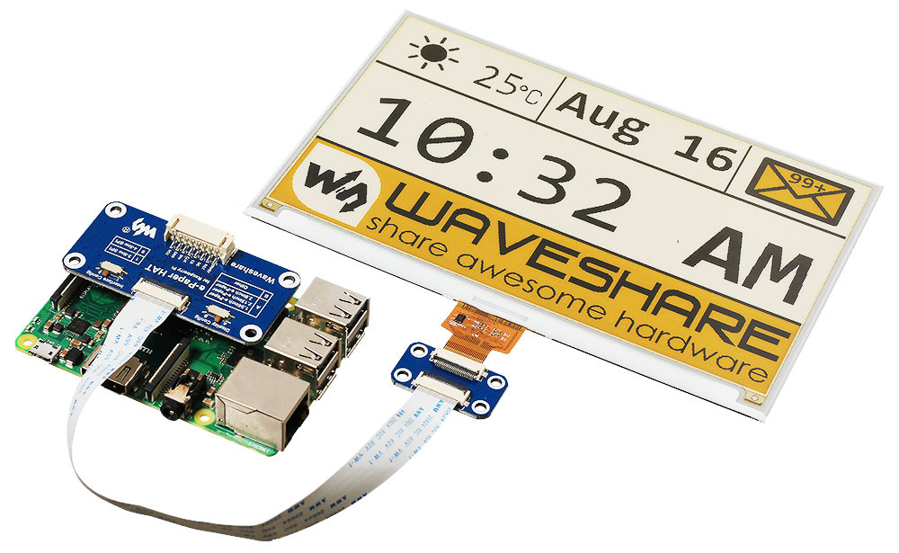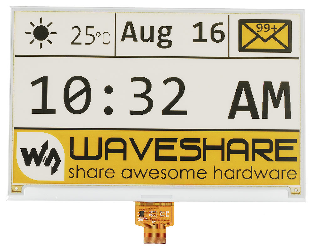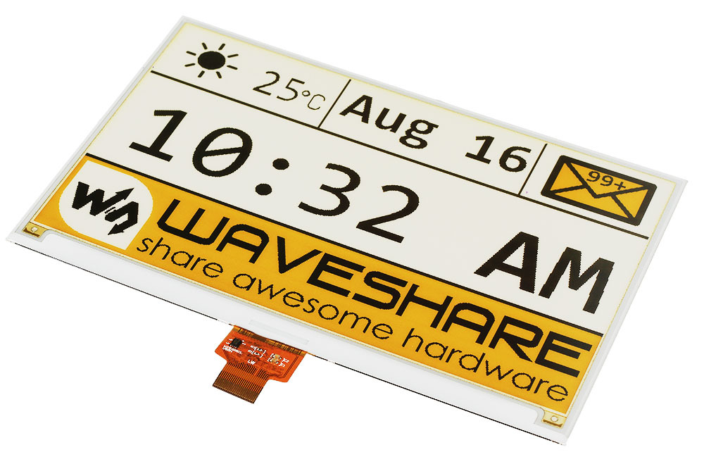 7,5-дюймовый экран на электронных чернилах E-Ink станет подходящей основой для часов с календарём и графическим прогнозом погоды или для самодельной электронной книги. При этом дисплей E-Ink расходует куда меньше энергии, чем ЖК-панель с подсветкой. А ещё он хранит изображение после отключения! Используйте дисплей на электронной бумаге там, где важно низкое энергопотребление, или когда обычному LCD-экрану не хватает читаемости и углов обзора.Особенности дисплеев E-InkСверхнизкое энергопотребление: подсветка не требуется, энергия тратится лишь на обновление экрана.Последнее изображение хранится даже при снятом питании.Свободные углы обзора и хорошая читаемость под прямым светом.Ограниченная палитра: в данном случае — чёрный, белый и жёлтый цвет без полутонов.Долгое время обновления, из-за чего экран не подходит для видео.НачинкаДанный экран E-Ink обладает диагональю 7,5 дюймов и разрешением 640×384 пикселей. Изображение выводится в чёрном, белом и жёлтом цвете без полутонов. У каждого пикселя есть только два состояния: включён и выключен. При обновлении изображения на экране происходит несколько циклов мерцания — не пугайтесь, это нормальное поведение дисплеев E-Ink.Экран поставляется в виде голой панели без аппаратного драйвера — в таком виде его можно встроить или наклеить на корпус устройства.Подключение и программированиеДисплей E-Ink общается с управляющей платой через интерфейс SPI. Для быстрого старта рекомендуем взять контроллер E-Ink на ESP32 или ESP8266 — самодостаточные платформы для разработки в среде Arduino IDE.Для подключения экрана к Arduino используйте драйвер e-Paper Shield, а для Raspberry Pi подойдёт плата e-Paper Driver HAT.Готовые библиотеки для дисплеев e-Paper позволяют выводить на них строки символов ASCII, примитивные геометрические фигуры, а также отрисовывать на экране монохромные изображения по точкам.Технические подробности и примеры работы вы найдёте в инструкции на нашей Wiki.Комплектация1× Экран E-InkХарактеристикиМодель: Waveshare 7.5inch e-Paper (C) (SKU 14144)Технология: электрофоретический дисплей (электронная бумага)Диагональ: 7,5 дюймовРазрешение: 640×384Цветность: чёрный, белый, жёлтый (2 градации: 0% и 100%)Полное время обновления: 16 сИнтерфейс: SPIНапряжение питания: 3,3 ВЭнергопотребление: менее 0,017 мВтРасход энергии на обновление: 38 мВтВидимая область экрана: 163,2×97,9 ммРазмеры панели: 170,2×111,2×1,2 ммРесурсыИнструкция, примеры использования и документацияДисплеи E-Ink: энергосберегающая альтернатива для LCDБиблиотека Waveshare e-Paper