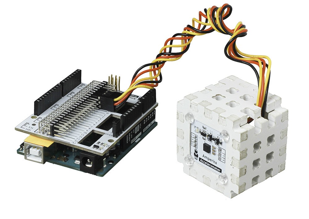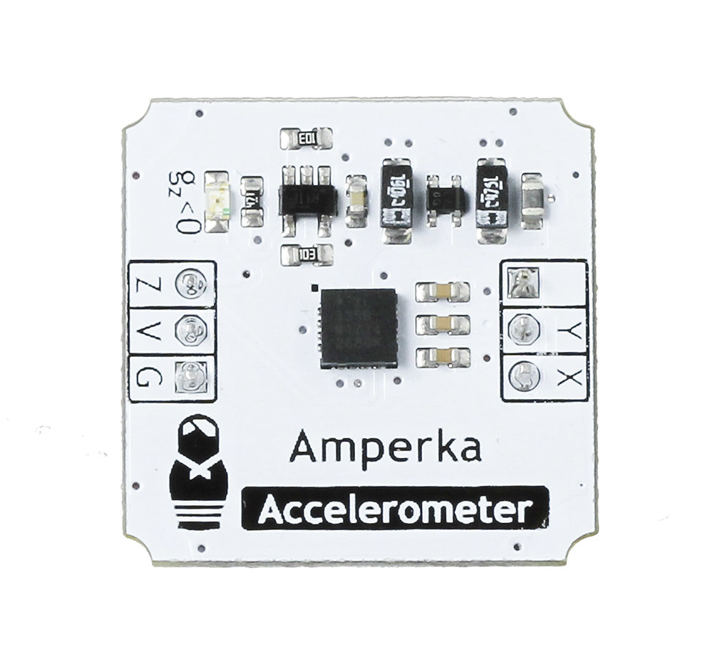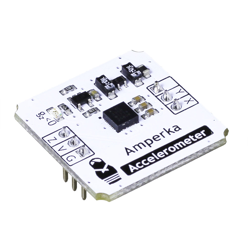 Если в вашем проекте необходимо знать где находится центр Земли, а все пины I2C уже заняты — возьмите аналоговый акселерометр.Трёхосный акселерометр (Troyka-модуль) позволяет определять ускорение действующее в направлении осей X, Y, Z и применяется для определения ориентации объекта в пространстве: углов крена и тангажа.Мы собрали модуль на чипе ADXL335 компании Analog Devices. Изначально чип рассчитан на рабочее напряжение от 1.8 до 3.6 Вольт, но мы добавили электронную обвязку и теперь модуль работает с трёх- и пятивольтовой логикой. Модуль подойдёт для плат Arduino и Iskra JS.Модуль независимо измеряет ускорения по всем трём осям и выводит результаты в виде изменения напряжения на трёх пинах.Внимание! В связи с тем, что выходные данные акселерометра завязаны на опорное напряжение управляющей платы, его необходимо калибровать. Для этого мы написали программу, которая предельно упрощает процесс.ПодключениеДатчик подключается через два трёхпроводных шлейфа.Нижняя тройка ног используется для подключения питания и вывода ускорений по оси Z.контакт Z — ускорение по оси Z. Подключите к аналоговому входу микроконтроллера.контакт V — к контакту питанияконтакт G — к землеВ верхней тройке используются всего две ноги:контакт X — ускорение по оси X. Подключите к аналоговому входу микроконтроллераконтакт Y — ускорение по оси Y. Подключите к аналоговому входу микроконтроллераПри подключении к Arduino или Iskra JS будет крайне удобно использовать Troyka Shield. Шлейфы для подключения включены в комплект.ХарактеристикиМодуль акселерометра: ADXL335Напряжение питания: 3.3–5 ВПотребляемый ток: 350 мкАВыходной интерфейс: три аналоговых пинаДиапазон измерения: G ±3gГабариты: 25,4×25,4 ммРесурсыВидеообзор модуля:Руководство по использованию, примеры и документацияЧто такое Troyka-модули?Библиотека для Arduinoбиблиотека для Iskra JS
