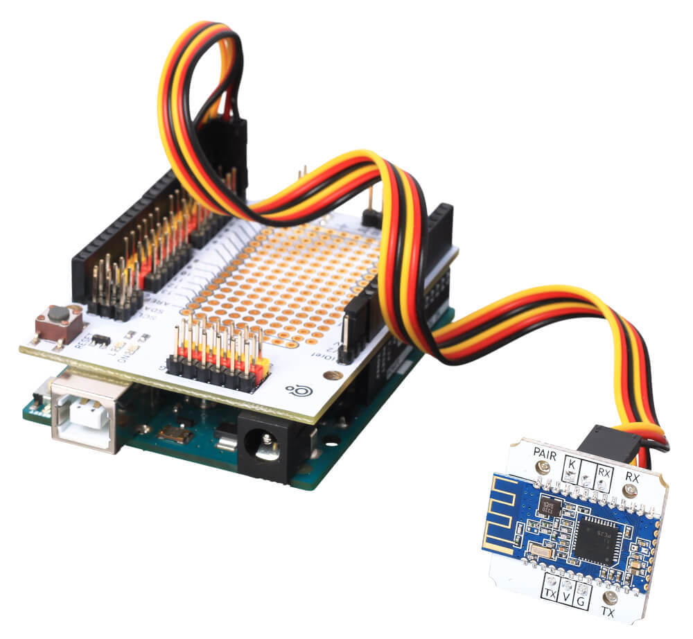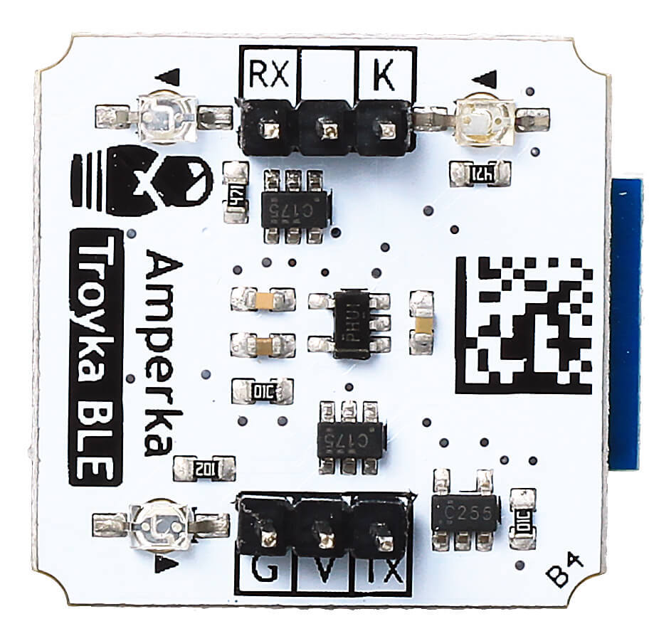 Подружите мобильного робота со смартфоном под Android или iOS. Соберите сеть Bluetooth-устройств для работы с удалёнными датчиками и сенсорами. Благодаря спецификации Web Bluetooth API вы сможете управлять устройствами из окна браузера.ОсобенностиСердце платформы — Bluetooth-модуль HM-10 c чипом CC2541 от компании Texas Instruments.Модуль использует технологию BLE (Bluetooth low energy — протокол с низким энергопотреблением), которая значительно продлевает время автономной работы портативных устройств.Убедитесь, что ваши устройства и мобильные приложения, к которым будет подключаться модуль, тоже поддерживают технологию BLE. Например, некоторые Legacy-программы под Android изначально соединяются через обычный Bluetooth, и с ними возможны проблемы совсместимости. В таких случаях вам подойдёт Troyka-модуль Bluetooth HC-05.ПодключениеНа модуле выведены две группы Troyka-контактов.Нижняя группаПитание (V) — соедините с рабочим напряжением микроконтроллера.Земля (G) — соедините с пином GND микроконтроллера.Сигнальный (TX) — цифровой выход модуля. Используется для передачи данных из Bluetooth в микроконтроллер. Подключите к пину RX управляющей платы.Верхняя группаСигнальный (RX) — цифровой вход модуля. Используется для приёма данных из микроконтроллера в Bluetooth. Подключите к пину TX управляющей платы.Сигнальный (K) — пин управления BLE-модулем. Подключите к сигнальному пину управляющей платы.При подключении к платформам Arduino и Iskra JS используйте плату расширения Troyka Shield. Или вовсе забудьте о проводах с Troyka Slot Shield.ПрограммированиеДля управляющих платформ модуль выглядит как «прозрачный» последовательный интерфейс.Настройки по умолчанию Имя устройстваHMSoftПароль для подключения000000Скорость передачи данных9600 бодБит чётностиNКоличество бит данных8Количество стоповых бит1Возврат каретки «\r»нетНовая строка «\n»нетДля начала работы необходимо настроить BLE-модуль в режиме AT-команд, после чего получится сопряжаться с другими Bluetooth-девайсами.Bluetooth работает в двух режимах:Slave — модуль ожидает подключения с других Bluetooth-устройств. Например, другого BLE-модуля или телефона.Master — модуль сам инициирует подключение к выбранному Bluetooth-девайсу.Подробности читайте в руководстве на нашей Wiki.Комплектация1× Плата-модуль2× Трёхпроводной шлейфХарактеристикиМодуль: HM-10 с чипом CC2541Версия Bluetooth: 4.0 с BLEРабочая частота: 2,4 ГГц ISMRF-мощность: -23 dbm, -6 dbm, 0 dbm, 6 dbmРадиус действия: до 10 метровВыходной интерфейс: UARTНапряжение питания: 3,3–5 ВПотребляемый ток:В активном режиме: до 10 мАВ спящем режиме: до 200 мкАГабариты: 25,4×25,4 ммРесурсыВидеообзор модуля BLE:Руководство по использованию, примеры и документацияЧто такое Troyka-модули?