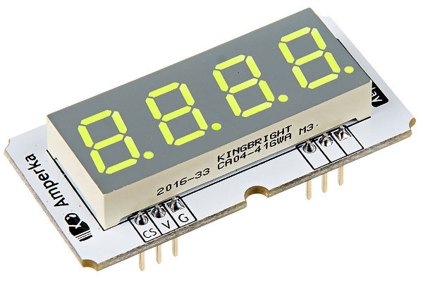 В вашем чудо-проекте необходимо выводить числа: значение с сенсора или текущее время? Четырёхразрядный семисегментный индикатор из линейки Troyka-модулей — самый простой способ решить задачу. С ним очень просто работать, вам не придётся возиться с пайкой, десятками резисторов и проводов на макетке — всё уже готово.Этот модуль содержит в себе четыре индикатора, при этом для управления ими достаточно одного порта SPI.Модуль работает с управляющими сигналами напряжением от 3 до 5 вольт. Поэтому индикатор совместим с большинством плат, в том числе с Raspberry Pi.Благодаря библиотеке QuadDisplay, работа с модулем не вызовет затруднений.Модуль из серии Troyka Module можно красиво разместить на лицевой панели вашего устройства, прикрутив его винтами М3.ПодключениеМодуль подключается к управляющей электронике двумя трёхпроводными шлейфами.С контроллером модуль общается по протоколу SPI через две тройки пинов.Верхняя группа контактов предназначена для получении данных от контроллера:контакт DI (или MOSI) — вход индикатора — подключите к пину DO микроконтроллераконтакт SCK — пин последовательного тактового сигнала — к пину генератора тактовых импульсовНижняя группа — для выбора устройства и питания:контакт CS — выбор ведомого устройства — подключите к пину SS микроконтроллераконтакт V — к контакту питания 3.3 — 5 Вконтакт G — к землеПри подключении к Arduino будет крайне удобно использовать Troyka LP Shield. Два шлейфа для подключения включены в комплект.Модуль физически совместим с breadboard’ом.Комплектация1× Плата-модуль2× Трёхпроводной шлейфХарактеристикиНапряжение питания: 3–5 ВМаксимальный потребляемый ток: 150 мА (при питании от 5 В)Габариты: 50,8×25,4 ммРесурсыИндикатор в проекте климат-контроля:Инструкция по использованию, примеры и документацияЧто такое Troyka-модули?Библиотека для ArduinoПростой климат-контрольЧасы Фишера для быстрых шахматЦифровые часыИгра «Саймон говорит…»МетеостанцияКухонный таймер