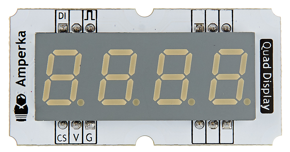 В вашем чудо-проекте необходимо выводить числа: значение с сенсора или текущее время? Четырёхразрядный семисегментный индикатор из линейки Troyka-модулей — самый простой способ решить задачу. С ним очень просто работать, вам не придётся возиться с пайкой, десятками резисторов и проводов на макетке — всё уже готово.Этот модуль содержит в себе четыре индикатора, при этом для управления ими достаточно одного порта SPI.Модуль работает с управляющими сигналами напряжением от 3 до 5 вольт. Поэтому индикатор совместим с большинством плат, в том числе с Raspberry Pi.Благодаря библиотеке QuadDisplay, работа с модулем не вызовет затруднений.Модуль из серии Troyka Module можно красиво разместить на лицевой панели вашего устройства, прикрутив его винтами М3.ПодключениеМодуль подключается к управляющей электронике двумя трёхпроводными шлейфами.С контроллером модуль общается по протоколу SPI через две тройки пинов.Верхняя группа контактов предназначена для получении данных от контроллера:контакт DI (или MOSI) — вход индикатора — подключите к пину DO микроконтроллераконтакт SCK — пин последовательного тактового сигнала — к пину генератора тактовых импульсовНижняя группа — для выбора устройства и питания:контакт CS — выбор ведомого устройства — подключите к пину SS микроконтроллераконтакт V — к контакту питания 3.3 — 5 Вконтакт G — к землеПри подключении к Arduino будет крайне удобно использовать Troyka LP Shield. Два шлейфа для подключения включены в комплект.Модуль физически совместим с breadboard’ом.Комплектация1× Плата-модуль2× Трёхпроводной шлейфХарактеристикиНапряжение питания: 3–5 ВМаксимальный потребляемый ток: 150 мА (при питании от 5 В)Габариты: 50,8×25,4 ммРесурсыИндикатор в проекте климат-контроля:Инструкция по использованию, примеры и документацияЧто такое Troyka-модули?Библиотека для ArduinoПростой климат-контрольЧасы Фишера для быстрых шахматЦифровые часыИгра «Саймон говорит…»МетеостанцияКухонный таймер