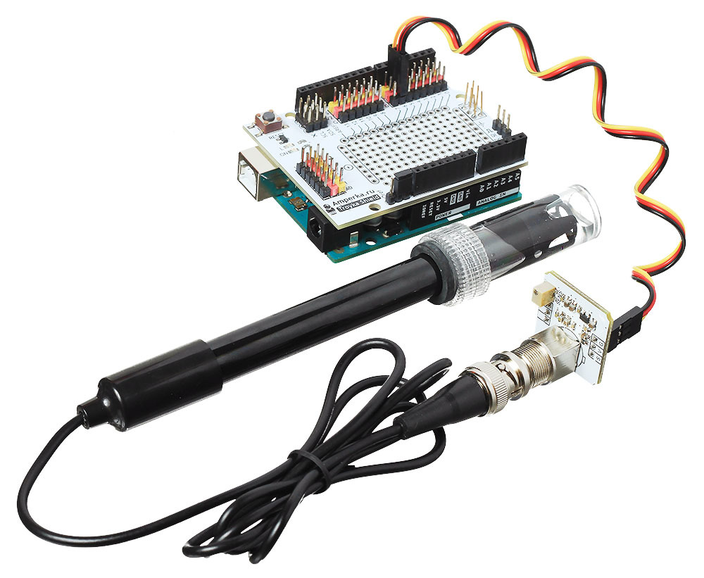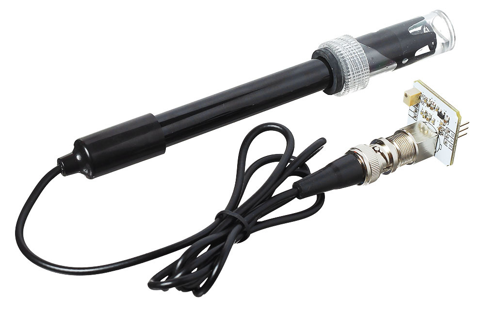 Надоело возиться с лакмусовыми бумажками в попытках определить pH-показатель раствора? Измеряйте кислотность жидкостей на Arduino с помощью электронного pH-метра в виде Troyka-модуля с погружным зондом. Он поможет создать комфортную среду для рыбок в аквариуме, приготовить питательный раствор для гидропонной системы выращивания растений, сделать домашний сок или квасное сусло.ОсобенностиДатчик кислотности содержит лабораторный pH-электрод с точностью ±0,1 pH, который рассчитан на единичные или непродолжительные замеры.Если вам нужен более продвинутый датчик, способный на непрерывные измерения с длительным погружением, — обратите внимание на промышленный pH-метр DFRobot Pro.Довольно часто pH-метр используется в паре с солемером — такой тандем позволяет контролировать не только кислотность среды, но и концентрацию растворённых солей в воде.Принцип работыВодородный показатель pH (лат. potentia Hydrogenii) — мера кислотности, которая отражает концентрацию ионов водорода в жидкости. Различают три степени кислотности водных растворов:pH<7 — кислотная среда;pH=7 — нейтральная среда;pH>7 — щелочная среда.Для измерения pH-показателя используют систему электродов, которые помещаются в раствор: по возникающей между ними ЭДС можно определить активность ионов водорода в жидкости. На этом эффекте основан принцип работы электронных датчиков кислотности.pH-метр состоит из двух частей: выносного зонда для измерений и датчика в виде Troyka-модуля, который занимается фильтрацией и усилением сигнала. Чтобы начать измерения кислотности раствора, достаточно погрузить в него измерительный щуп, и примерно через минуту можно снимать стабильные показания.Для точных измерений нужно периодически проводить калибровку pH-метра. Для этого удобно пользоваться буферным раствором с эталонной кислотностью pH=7,0, который залит в колпачке для хранения щупа. Не выливайте калибровочный раствор — он вам ещё пригодится!ПитаниеpH-метр питается напряжением 3,3–5 В и потребляет ток до 25 мА. Выходной сигнал датчика — аналоговое напряжение в диапазоне от 0 до 0,8 Vcc.ПодключениеИзмерительный зонд подключается к модулю обработки сигнала через разъём BNC. Модуль датчика кислотности подключается к управляющей электронике через трёхпроводной интерфейс.S — сигнал датчика, подключаемый к аналоговому входу управляющей платы.V — питание сенсора (3,3–5 В).G — общая земля.Датчик входит в экосистему Troyka, которая позволяет подключать модули через плату расширения Troyka Shield аккуратными шлейфами без торчащих проводов. А если использовать Troyka Slot Shield, вы сможете обойтись вовсе без проводов.В случае с Raspberry Pi вам понадобится плата расширения Troyka HAT, оснащённая встроенным АЦП для работы с аналоговыми датчиками.Комплектация1× Датчик кислотности жидкости (Troyka-модуль)1× Погружной зонд с буферным раствором pH=7,01× Трёхпроводной шлейфХарактеристикиpH-электрод: Ag/AgClНапряжение питания: 3,3–5 ВПотребляемый ток: до 25 мАСигнал датчика: аналоговыйДиапазон выходного сигнала:При питании 5 В: 0–4 ВПри питании 3,3 В: 0–2,6 ВДиапазон измерений: 0–14 pHТочность измерений: ±0,1 pH (при 25 °C)Длина кабеля щупа: 0,9 мРазмеры модуля: 25,4×25,4×39,1 ммРазмеры щупа: 143,7×19,5×19,5 ммРесурсыИнструкция, примеры использования и документацияЧто такое Troyka-модули?
