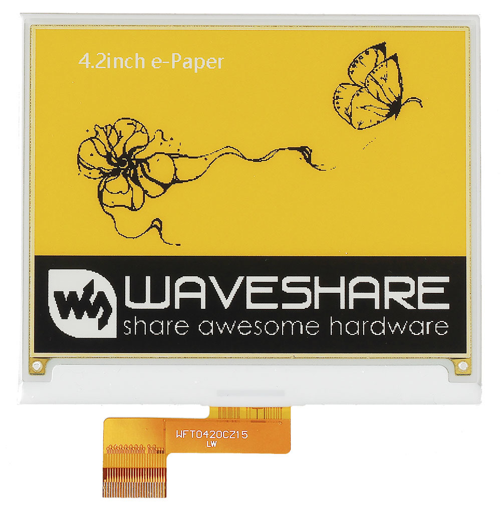 4,2-дюймовый экран на электронных чернилах E-Ink станет подходящей основой для часов с календарём и графическим прогнозом погоды или для электронного ценника. При этом дисплей E-Ink расходует куда меньше энергии, чем ЖК-панель с подсветкой. А ещё он хранит изображение после отключения! Используйте дисплей на электронной бумаге там, где важно низкое энергопотребление, или когда обычному LCD-экрану не хватает читаемости и углов обзора.Особенности дисплеев E-InkСверхнизкое энергопотребление: подсветка не требуется, энергия тратится лишь на обновление экрана.Последнее изображение хранится даже при снятом питании.Свободные углы обзора и хорошая читаемость под прямым светом.Ограниченная палитра: в данном случае — чёрный, белый и жёлтый цвет без полутонов.Долгое время обновления, из-за чего экран не подходит для видео.НачинкаДанный экран E-Ink обладает диагональю 4,2 дюйма и разрешением 400×300 пикселей. Изображение выводится в чёрном, белом и жёлтом цвете без полутонов. У каждого пикселя есть только два состояния: включён и выключен. При обновлении изображения на экране происходит несколько циклов мерцания — не пугайтесь, это нормальное поведение дисплеев E-Ink.Экран поставляется в виде голой панели без аппаратного драйвера — в таком виде его можно встроить или наклеить на корпус устройства.Подключение и программированиеДисплей E-Ink общается с управляющей платой через интерфейс SPI. Для быстрого старта рекомендуем взять контроллер E-Ink на ESP32 или ESP8266 — самодостаточные платформы для разработки в среде Arduino IDE.Для подключения экрана к Arduino используйте драйвер e-Paper Shield, а для Raspberry Pi подойдёт плата e-Paper Driver HAT.Готовые библиотеки для дисплеев e-Paper позволяют выводить на них строки символов ASCII, примитивные геометрические фигуры, а также отрисовывать на экране монохромные изображения по точкам.Технические подробности и примеры работы вы найдёте в инструкции на нашей Wiki.Комплектация1× Экран E-InkХарактеристикиМодель: Waveshare 4.2inch e-Paper (C) (SKU 14188)Технология: электрофоретический дисплей (электронная бумага)Диагональ: 4,2 дюймаРазрешение: 400×300Цветность: чёрный, белый, жёлтый (2 градации: 0% и 100%)Полное время обновления: 15 сИнтерфейс: SPIНапряжение питания: 3,3 ВЭнергопотребление: менее 0,017 мВтРасход энергии на обновление: 26,4 мВтВидимая область экрана: 84,8×63,6 ммРазмеры панели: 90,1×77×1,2 ммРесурсыИнструкция, примеры использования и документацияДисплеи E-Ink: энергосберегающая альтернатива для LCDБиблиотека Waveshare e-Paper