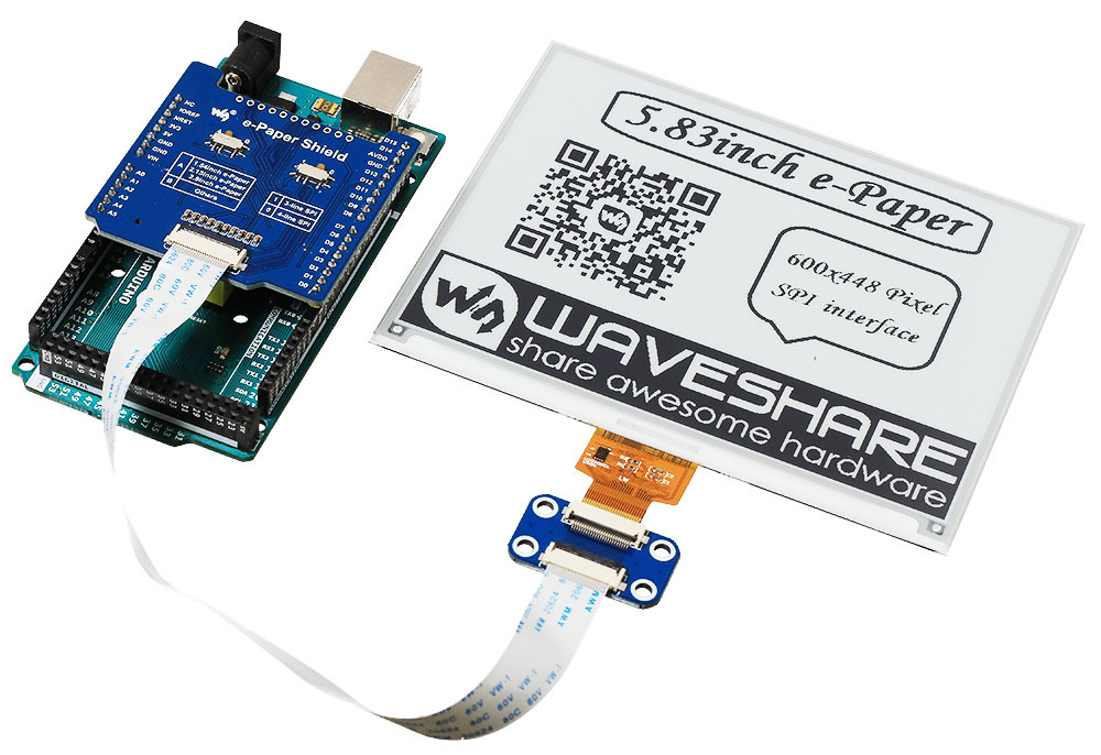 5,83-дюймовый экран на электронных чернилах E-Ink станет подходящей основой для часов с календарём и графическим прогнозом погоды или для самодельной электронной книги. При этом дисплей E-Ink расходует куда меньше энергии, чем ЖК-панель с подсветкой. А ещё он хранит изображение после отключения! Используйте дисплей на электронной бумаге там, где важно низкое энергопотребление, или когда обычному LCD-экрану не хватает читаемости и углов обзора.Особенности дисплеев E-InkСверхнизкое энергопотребление: подсветка не требуется, энергия тратится лишь на обновление экрана.Последнее изображение хранится даже при снятом питании.Свободные углы обзора и хорошая читаемость под прямым светом.Ограниченная палитра: в данном случае — чёрный, белый и красный цвет без полутонов.Долгое время обновления, из-за чего экран не подходит для видео.НачинкаДанный экран E-Ink обладает диагональю 5,83 дюйма и разрешением 600×448 пикселей. Изображение выводится в чёрно-белом формате без полутонов. У каждого пикселя есть только два состояния: включён и выключен. При обновлении изображения на экране происходит несколько циклов мерцания — не пугайтесь, это нормальное поведение дисплеев E-Ink.Экран поставляется в виде голой панели без аппаратного драйвера — в таком виде его можно встроить или наклеить на корпус устройства.Подключение и программированиеДисплей E-Ink общается с управляющей платой через интерфейс SPI. Для быстрого старта рекомендуем взять контроллер E-Ink на ESP32 или ESP8266 — самодостаточные платформы для разработки в среде Arduino IDE.Для подключения экрана к Arduino используйте драйвер e-Paper Shield, а для Raspberry Pi подойдёт плата e-Paper Driver HAT.Готовые библиотеки для дисплеев e-Paper позволяют выводить на них строки символов ASCII, примитивные геометрические фигуры, а также отрисовывать на экране монохромные изображения по точкам.Технические подробности и примеры работы вы найдёте в инструкции на нашей Wiki.Комплектация1× Экран E-InkХарактеристикиМодель: Waveshare 5.83inch e-Paper V1 (SKU 14410)Технология: электрофоретический дисплей (электронная бумага)Диагональ: 5,83 дюймаРазрешение: 600×448Цветность: чёрно-белый (2 уровня серого: 0% и 100%)Полное время обновления: 3,5 сИнтерфейс: SPIНапряжение питания: 3,3 ВЭнергопотребление: менее 0,017 мВтРасход энергии на обновление: 26,4 мВтВидимая область экрана: 118,8×88,3 ммРазмеры панели: 125,4×99,5×1,2 ммРесурсыИнструкция, примеры использования и документацияДисплеи E-Ink: энергосберегающая альтернатива для LCDБиблиотека Waveshare e-Paper