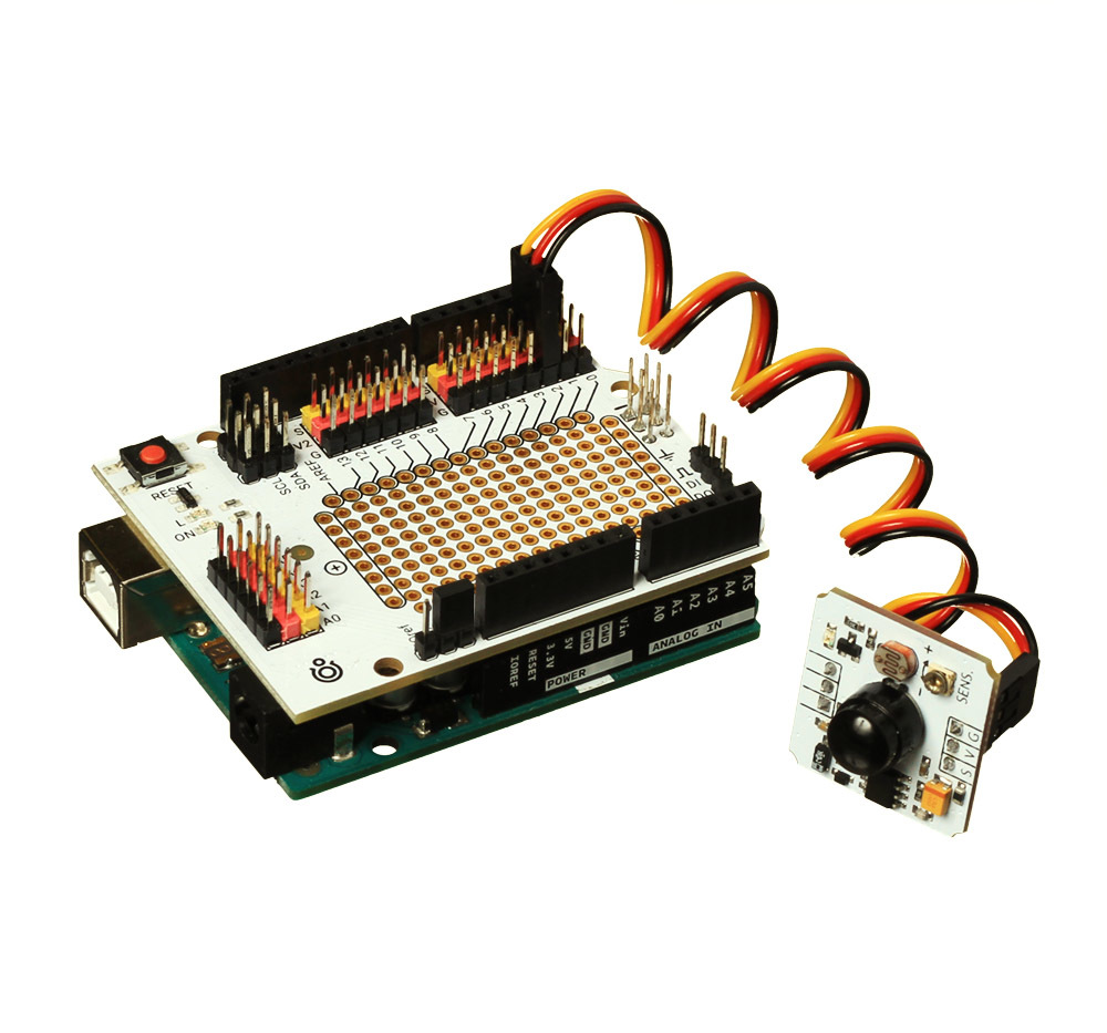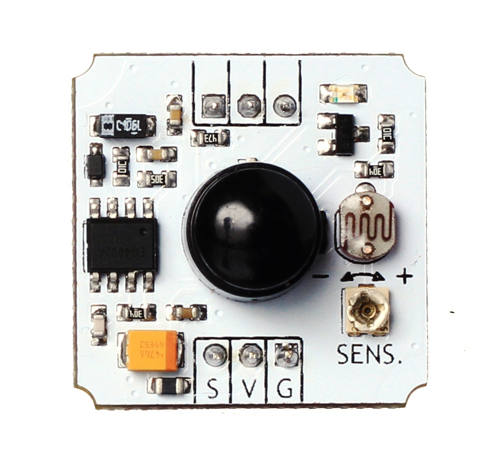 Инфракрасный сенсор засечёт перемещение тёплых объектов: людей или животных.Датчик защитит дом от недоброжелателей, а в офисе поможет автоматизировать входные двери. Если встроите модуль в умный автополив, то датчик обнаружит движение на газоне и вас не окатит водой.Принцип работыДатчик использует пироэлектрический эффект. При появлении теплового инфракрасного излучения в кристалле возникают электрические импульсы.PIR-сенсор с двумя разнополярными чувствительными элементами считывает температуру окружающей среды. Когда в зоне видимости появляется тёплый объект, на первом элементе появляется положительный импульс. Объект движется дальше и попадает в поле зрения второго элемента, на котором возникает отрицательный импульс. Разнонаправленные импульсы фиксируются чипом обработки данных. На выходе модуля появляется высокий логический сигнал.Настройка модуляНа модуле расположен потенциометр для регулировки чувствительности сенсора.ПодключениеНа сенсоре расположена группа Troyka-контактов:Сигнальный (S) — цифровой выход сенсора. Используется для передачи текущего состояния модуля. Подключите к цифровому пину микроконтроллера.Питание (V) — соедините с рабочим напряжением микроконтроллера.Земля (G) — соедините с землёй микроконтроллера.Для подключения к платформам Arduino и Iskra JS мы придумали плату расширения Troyka Shield. С Troyka Slot Shield провода не понадобятся вовсе.Для работы с Raspberry Pi используйте Troyka HAT.Комплектация1× Сенсорный модуль1× Трёхпроводной шлейфХарактеристикиНапряжение питания: 3,3–5 ВРасстояние наблюдения: 7 мУгол обзора: 110°Длительность сигнала при обнаружении движения: 5 секундГабариты: 25,4×25,4 ммРесурсыРуководство по использованию, примеры и документацияЧто такое Troyka-модули?