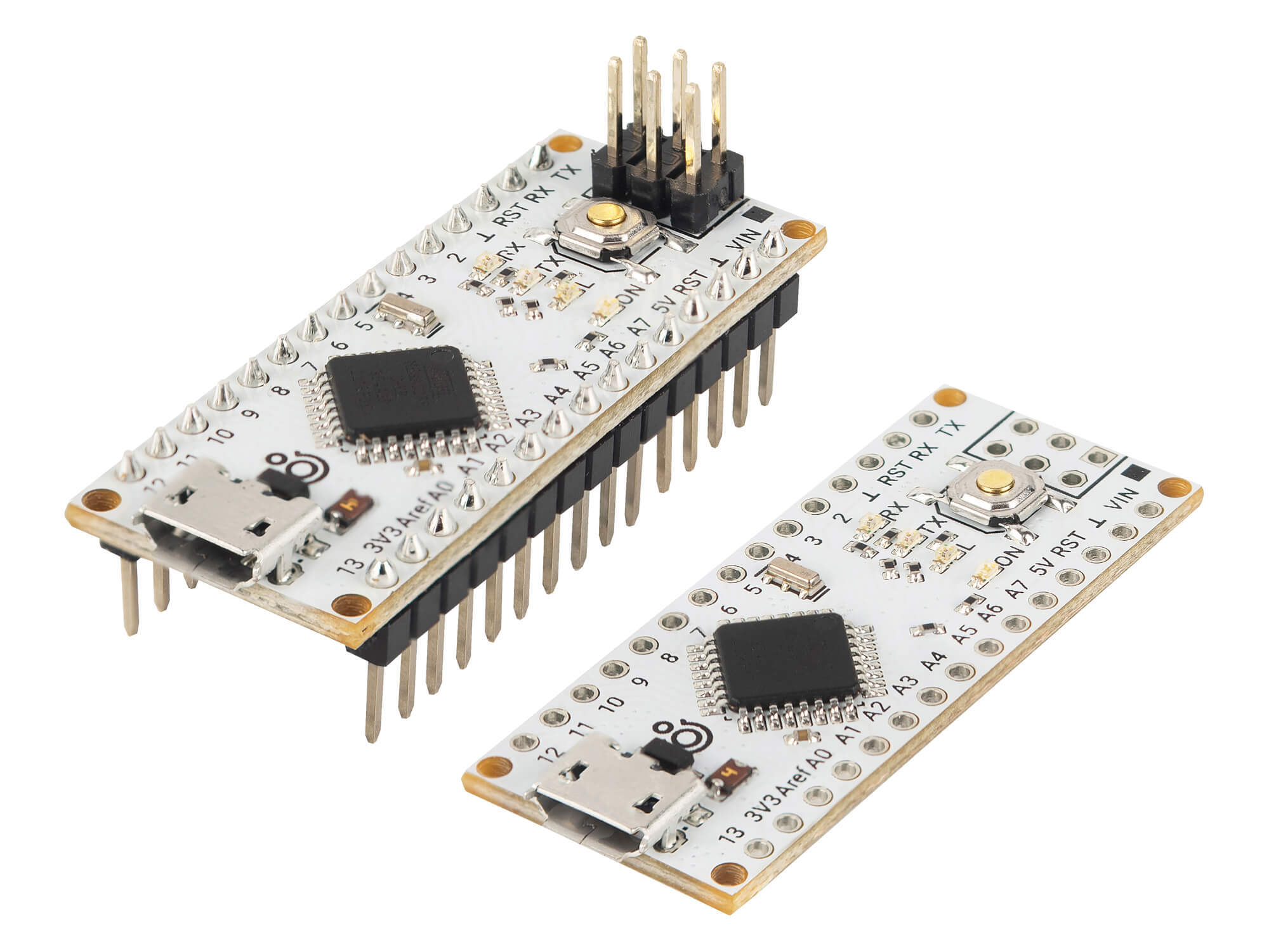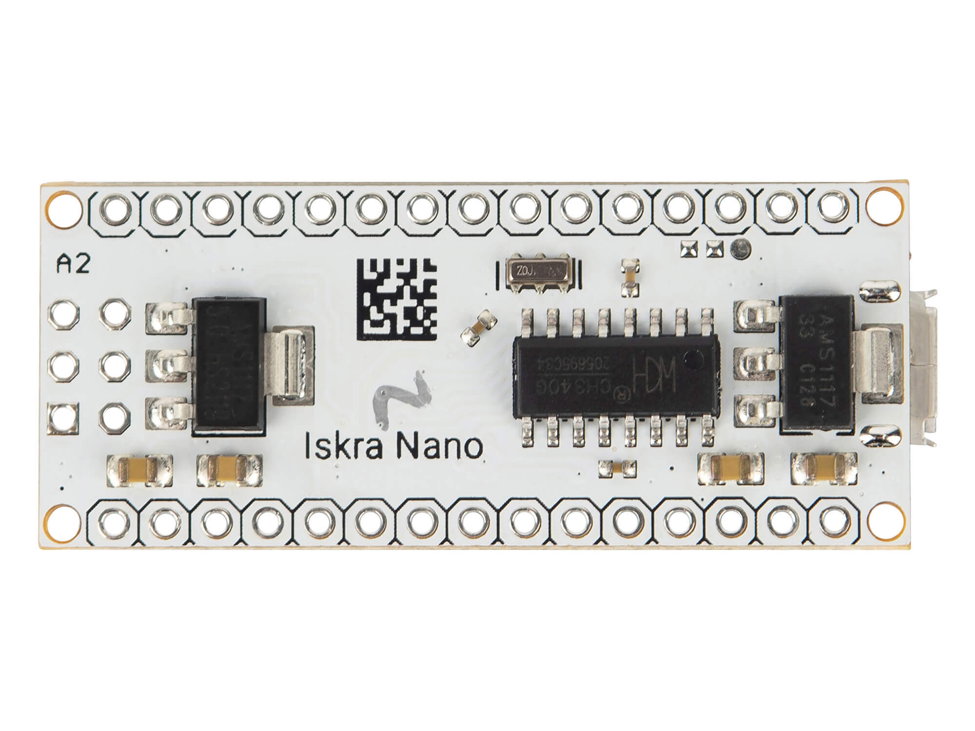 Iskra Nano — миниатюрная платформа для разработки встраиваемых систем. Используйте плату в местах, куда полноразмерной Arduino не пробраться: в переносном GPS-трекере, алкотестере или другом портативном устройстве.Iskra Nano также позволит создать недорогую систему из множества микроконтроллеров, например, оборудовать одной управляющей платой каждую комнату в квеструме.Версия платы без контактных ножек подходит для самых миниатюрных проектов. Для прототипирования на макетной плате пригодится модификация Iskra Nano с ногами.ОсобенностиПолная аппаратная и программная совместимость с Arduino Nano.Более мощный регулятор напряжения выдаёт ток до 1 А на шине 3,3 В.Произведено в России с любовью и соблюдением высоких технических норм.НачинкаСердце платы Iskra Nano — 8-битный микроконтроллер Microchip ATmega328P семейства AVR с тактовой частотой 16 МГц. На борту содержится 2 КБ оперативной памяти, 32 КБ флеш-памяти и 1 КБ EEPROM. Точно такой же чип установлен на оригинальной Arduino Nano.Однако мы выпускаем две версии платформы: стандартную Iskra Nano и улучшенную Iskra Nano Pro на случай, если вам понадобится больше интерфейсов. Arduino NanoIskra NanoIskra Nano ProМикроконтроллерATmega328PATmega328PATmega328PBКонтакты с ШИМ669Аппаратный интерфейс SPI112Аппаратный интерфейс UART112Выходной ток с пина 5V800 мА1 А1 АВыходной ток с пина 3V350 мА1 А1 АНаличие тач-интерфейсаНетНетДаРазъём USBMini-USBMicro-USBMicro-USBИнтерфейсыПо бокам платы расположены 30 контактов со стандартным шагом 2,54 мм. Чтобы использовать Iskra Nano с макетными платами, вам понадобится припаять к ней штыревую вилку.Для подключения периферии отведено 22 контакта ввода-вывода общего назначения (GPIO) с дополнительными возможностями.8 контактов принимают аналоговый сигнал через 10-битный АЦП.6 контактов позволяют вывести аналоговое значение с помощью 8-битного ШИМ-сигнала.Предусмотрены аппаратные интерфейсы UART, SPI и I²C.ПрограммированиеПлата Iskra Nano программируется как в привычной среде Arduino IDE, так и с помощью графического языка программирования XOD IDE. В обоих случаях контроллер ведёт себя как стандартная Arduino Nano, поэтому смело указывайте её в настройках. Из этого также следует, что Iskra Nano совместима со всеми проектами и примерами кода, написанными для Нано.ПитаниеПлатформа питается через разъём Micro-USB или напрямую через контакт Vin.При питании через USB подойдёт наш сетевой адаптер с кабелем Micro-USB.Для питания через пин Vin используйте источник напряжения на 7–12 В или батарейный отсек.Комплектация1× Плата Iskra Nano (без ног)ХарактеристикиМодель: Amperka Iskra Nano (AMP-B225)Микроконтроллер: ATmega328PАрхитектура: AVR (8 бит)Тактовая частота: 16 МГцFlash-память: 32 КБ (2 КБ занимает загрузчик)SRAM-память: 2 КБEEPROM-память: 1 КБКонтакты ввода-вывода: 22Контакты с АЦП: 8Разрядность АЦП: 10 битКонтакты с ШИМ: 6Разрядность ШИМ: 8 битАппаратные интерфейсы:1× SPI1× I²C1× UARTЛогический уровень напряжения: 5 ВВходное напряжение питания:Через USB: 5 ВЧерез пин Vin: 7–12 ВМаксимальный выходной ток пина 5V: 1 AМаксимальный выходной ток пина 3V3: 1 AМаксимальный ток с пина или на пин: 40 мАРазмеры: 45×18×4,5 ммРесурсыИнструкция, примеры использования и документация