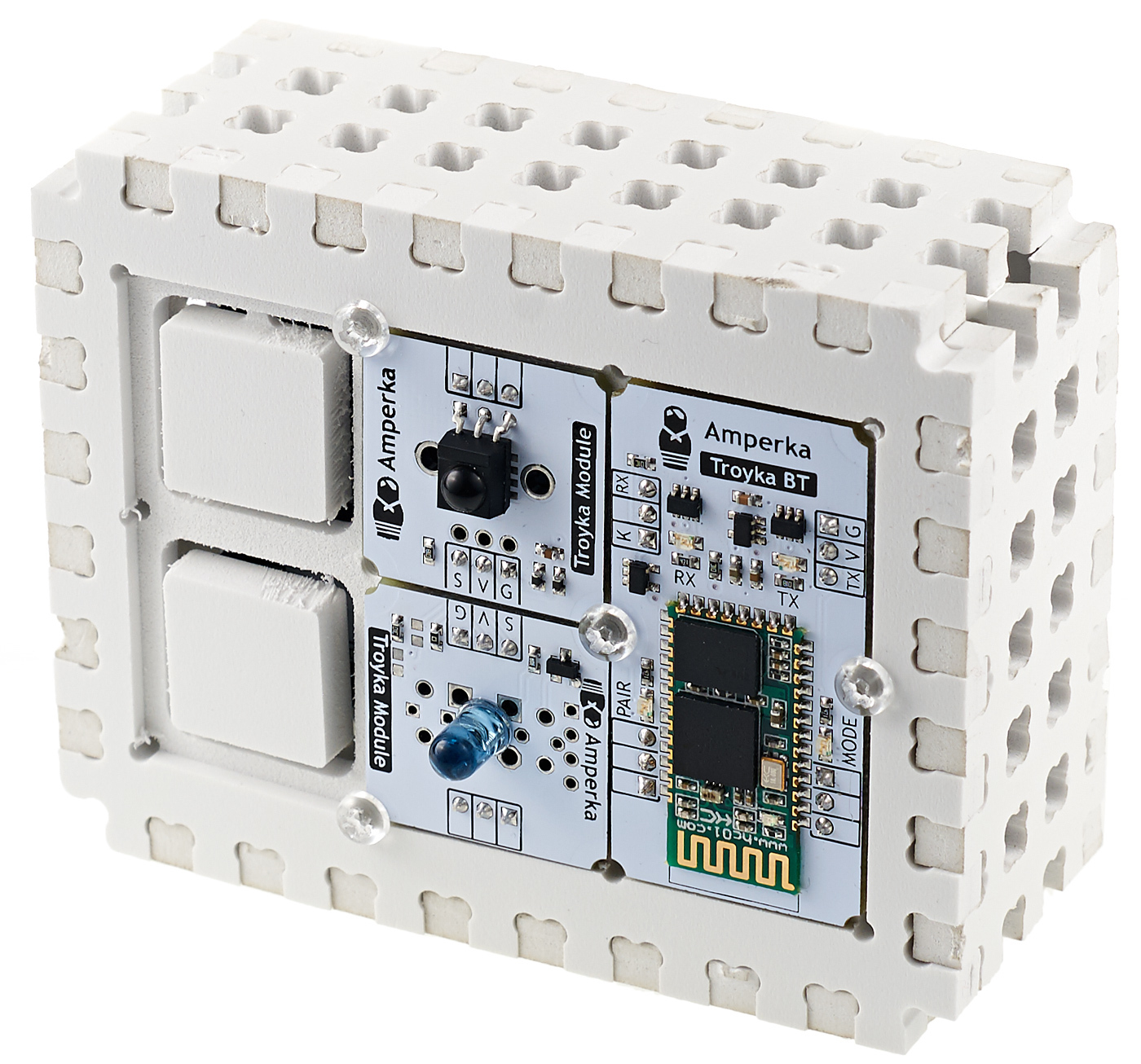 Воплощение задумки за редкий свободный вечер — это то, о чём мечтает любой семьянин. Но после творческого рывка, устройство мечты обычно похоже на тарелку макарон, сдобренных изолентой. Мы знаем, о чём говорим — сами такие. Чтобы гаджет тешил не только душу но и взор, возьмите #Slot Box.#Slot Box — не просто коробка. Это идеология быстрой и аккуратной сборки самоделок. Используйте Arduino Leonardo, Iskra Neo или Iskra JS вместе с Troyka Slot Shield. Возьмите от одного до шести Troyka-модулей в качестве датчиков и исполнительных устройств. Упакуйте всё в #Slot Box и оцените результат. Гаджет отлично выглядит, да и на программирование время осталось.А чтобы заинтересовать будущих инженеров тем, во что играет папа, мы добавили деталей — корпус в три щелчка превращается в кубического котика.Повертеть 3D модель бокса.Про #структорИзготовление корпуса для девайса мечты из подручных средств — та ещё морока. Вместо палок и скотча используйте #структор.#Структор — это решётчатый конструктор для быстрой сборки корпусов и механических узлов вашего умного устройства. Это удобные крепления для распространённой хобби-электроники и электромеханики. Это детальки, с помощью которых вы быстро превратите комочек запутанных проводов в законченное, опрятное устройство. Наконец-то самоделка станет приятным элементом декора.#Структор разработан и выпускается Амперкой. Мы изготавливаем детали фрезеровкой из 5 мм вспененного ПВХ.Это очень лёгкий материал, его плотность всего 0,55 г/см³. Прочности материала и соединений хватает для использования в качестве конструктивного элемента при изготовлении корпусов или небольших роботов.#Структор — не одноразовый, но и не очень многоразовый. Ресурса деталей хватит на десяток-другой сопряжений друг с другом, после чего материал запоминает деформацию и держится не плотно.Детали легко резать ножом, склеивать суперклеем и красить. Подробнее о всех возможностях #структора читайте на [вики].Все детали поставляются в специальной матрице, размером 17×17 мм. Чтобы извлечь деталь из матрицы используйте скальпель или канцелярский нож.Габаритный чертёжРазмер любой стороны детали в сантиметрах легко вычислить, посчитав шипы. Количество шипов плюс 0,5 см и будет размером стороны.Технические характеристикиМатериал: вспененный ПВХ шириной 5 ммТемпературный диапазон: 0…+60 °CПлотность: 0,55 г/см³Для крепления платы к деталям используйте винты М3.СсылкиТехническое описаниеЧертежи для самостоятельного изготовленияИстория создания конструктора на Habrahabr.ruРесурсыSlot Box в проекте ИК-репитера:Универсальный пульт управления из смартфона