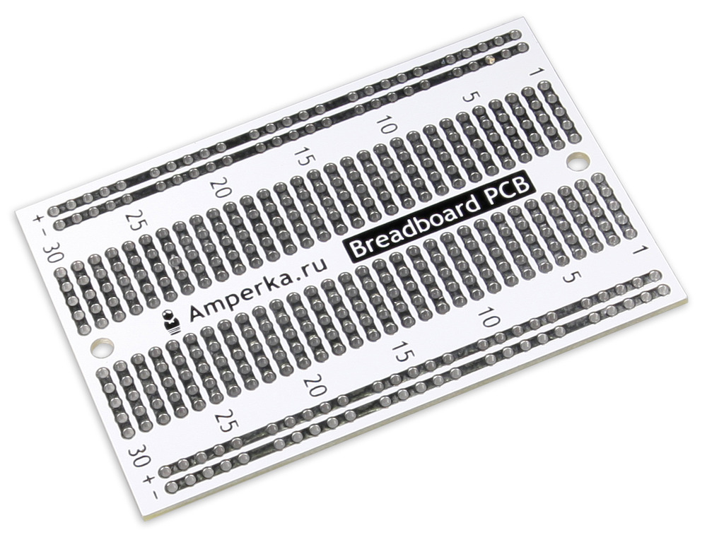 Когда схема давно отлажена на беспаечной макетной плате и прекрасно работает, как превратить её в готовое устройство без кропотливого труда по изготовлению печатной платы? Воспользуйтесь этой макетной платой.Breadboard PCB — это привычная полуразмерная макетная плата, но изготовленная специально под пайку. С ней вам останется только перенести все компоненты с макетной платы, и запаять их. Новые проекты наконец-то дождутся освободившейся макетки, а результаты кропотливого труда по проектированию устройства не пропадут зря и будут увековечены.В отличие от полноразмерной версии, на этой доске 400 отверстий-контактов. Она может оказаться полезной, если размер устройства имеет значение и полноразмерной макетной платы слишком много. Четыре рельсы по бокам предназначены для подключения питания и земли.Габаритный чертёжРесурсыМакетная плата в проекте POV-спидометра:POV-спидометр для велосипеда