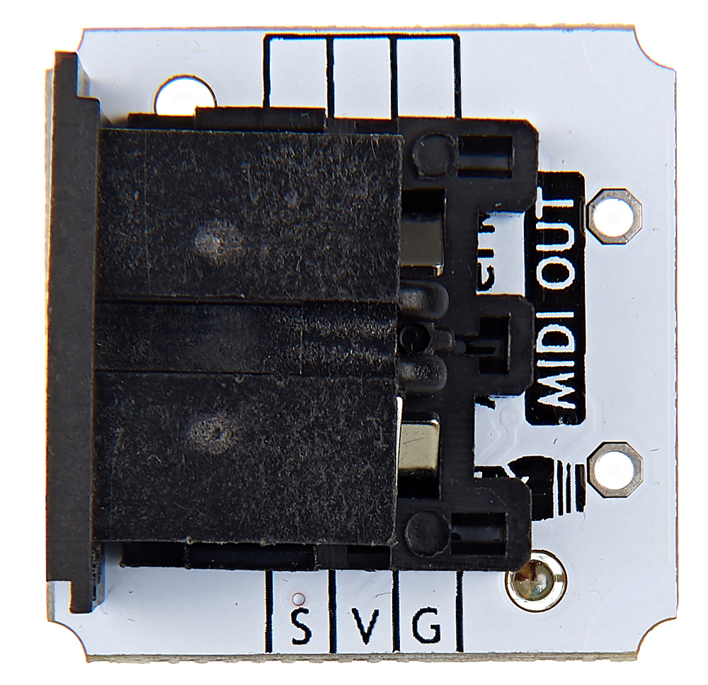 Компактный MIDI out превратит микроконтроллер в лазерную арфу, синтезатор треков для 8-битных игр или оригинальную драм-машину.Troyka-модуль позволяет подключать самодельные устройства к профессиональному звуковому и сценическому оборудованию по интерфейсу MIDI.Что такое MIDIMusical Instrument Digital Interface (цифровой интерфейс музыкальных инструментов) или MIDI — популярный стандарт обмена цифровыми данными между музыкальными инструментами, сценическим оборудованием, видеомикшерами и компьютерами.Интерфейс позволяет исполнителю нажав клавишу на одном инструменте, получить звук с другого устройства. Любое изменение положения клавиш, кнопок или регуляторов кодируются в управляющие команды, которые можно передать по MIDI-кабелю на другие инструменты. Получившее команду устройство реагирует на неё аналогично нажатию на собственные клавиши.MIDI определяет единый формат кодирования данных о нажатии клавиш, параметрах звучания и дополнительных настройках оборудования.На физическом уровне MIDI — это однонаправленный интерфейс, который объединяет устройства в единую шину. Источник сигнала передает данные по двум проводам на расстояние до 15 метров. Передача сигнала осуществляется током силой 5 мА, включение тока передаёт 0, выключение — 1.ПодключениеС контроллером модуль общается по протоколу схожему с UART.Нижняя группа контактов предназначена для организации обмена данными:контакт S — подключите к пину TX микроконтроллераконтакт V — к контакту питания 3.3 — 5 Вконтакт G — к землеВерхние ноги служат для надёжного крепления модуля на Slot Shield.На модуле предусмотрен индикатор передачи данных — при отправке данных зажигается красный светодиод.Комплектация1× Плата-модуль MIDI out1× Трёхпроводной шлейфХарактеристикиНапряжение питания: 3,3–5 ВТемпературный диапазон: −40…+85 °CГабариты: 25,4×25,4×30,5 ммРесурсыВидеообзор MIDI модулей:Руководство по использованию, примеры и документацияЧто такое Troyka-модули?Библиотека для Arduinoбиблиотека для IskraJS