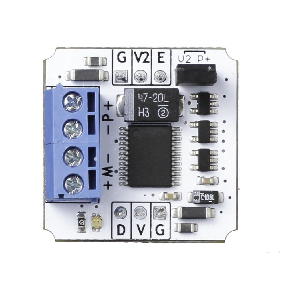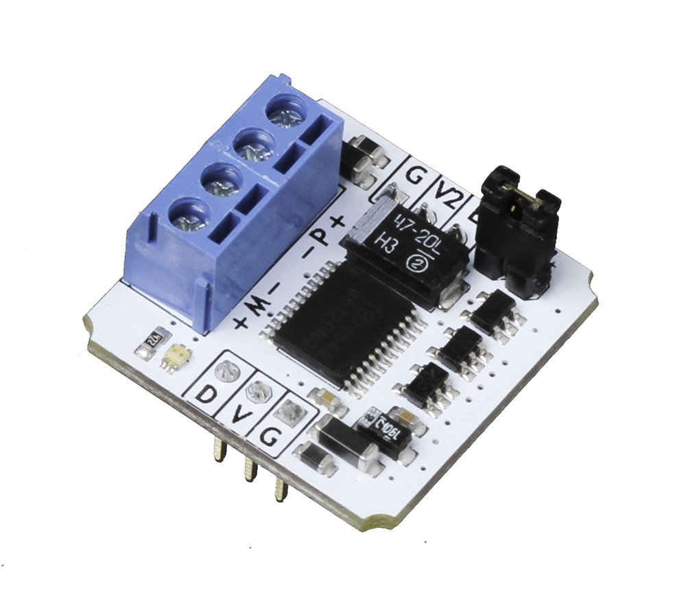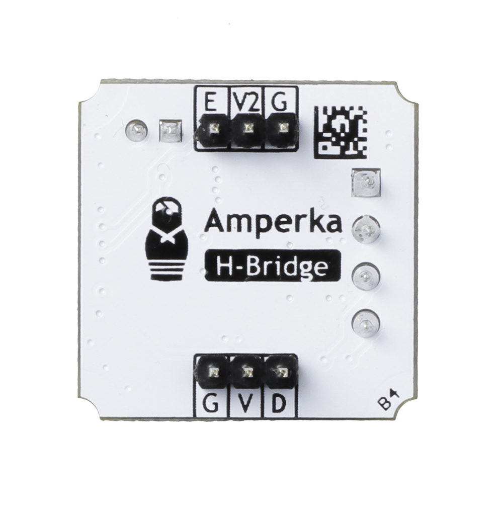 Коллекторные моторы — самые доступные и простые электродвигатели. Всего два провода: подключаешь один к плюсу, второй к минусу — и двигатель крутится. Поменял провода местами, направление вращения изменится. Беда в том, что напрямую к Arduino такой мотор не подключишь.Микроконтроллеры не предназначены для работы с мощной нагрузкой, сила тока на GPIO измеряется всего десятками миллиампер. Даже слабым моторам нужно в разы больше.Если в проекте мотор всегда должен вращаться в одном направлении, можно использовать силовой ключ. Но если понадобится реверсировать двигатель, придётся менять местами провода. Или подключить мотор через Н-мост.Если вам необходимо рулить сразу двумя двигателями — воспользуйтесь двухканальным H-мостом или Motor Shield.НачинкаМодуль построен на основе полупроводникового чипа TB6612FNG от компании Toshiba. Он рассчитан на управление моторами постоянного тока и выдерживает пики до 3 Ампер. Для продолжительной работы используйте моторы, рассчитанные на 1,2 Ампера.При разгоне и торможении коллекторные моторы индуцируют кратковременный обратный ток большой величины, который может выжечь контакты микроконтроллера. На модуле предусмотрена обвязка, которая это предотвращает.Два светодиода предназначены для индикации режима работы. Цвет информирует о направлении, яркость — о скорости вращения мотора.ПодключениеМодуль подключается к управляющей электронике двумя трёхпроводными шлейфами.Контакт D модуля подключите к любому выходу контроллера. Сигнал на пине определяет направление вращения мотора.Контакт V подключите к контакту питания 3,3–5 В.Контакт G подключите к земле.Контакт E используется для управления скоростью вращения. Высокий сигнал запускает мотор. Для изменения скорости используйте ШИМ.Клеммы M+/М- предназначены для подключения электромотора постоянного тока.ПитаниеМодуль H-моста питается от внешнего источника, подключаемого к клеммам P+/P−.Следите, чтобы характеристики блока питания соответствовали номиналам мотора. Поддерживаются двигатели с рабочим напряжением 3,3–12 В и током до 1,2 А.Комплектация1× Плата-модуль H-моста2× Трёхпроводной шлейфХарактеристикиДрайвер моторов: Toshiba TB6612FNGКоличество подключаемых моторов: 1Напряжение логической части: 3,3–5 ВНапряжение силовой части: 3,3–12 ВРабочая сила тока: до 1,2 AДопустимая пиковая нагрузка: до 3,2 AМаксимальная частота переключения (ШИМ): 100 кГцГабариты: 25,4×25,4 ммРесурсыКак устроен Н-мост:Руководство по использованию, примеры и документацияЧто такое Troyka-модули?Библиотека для Espruino