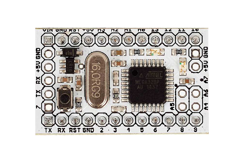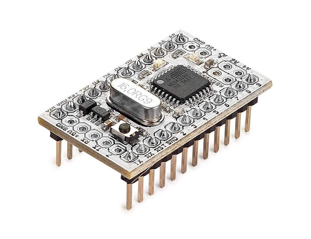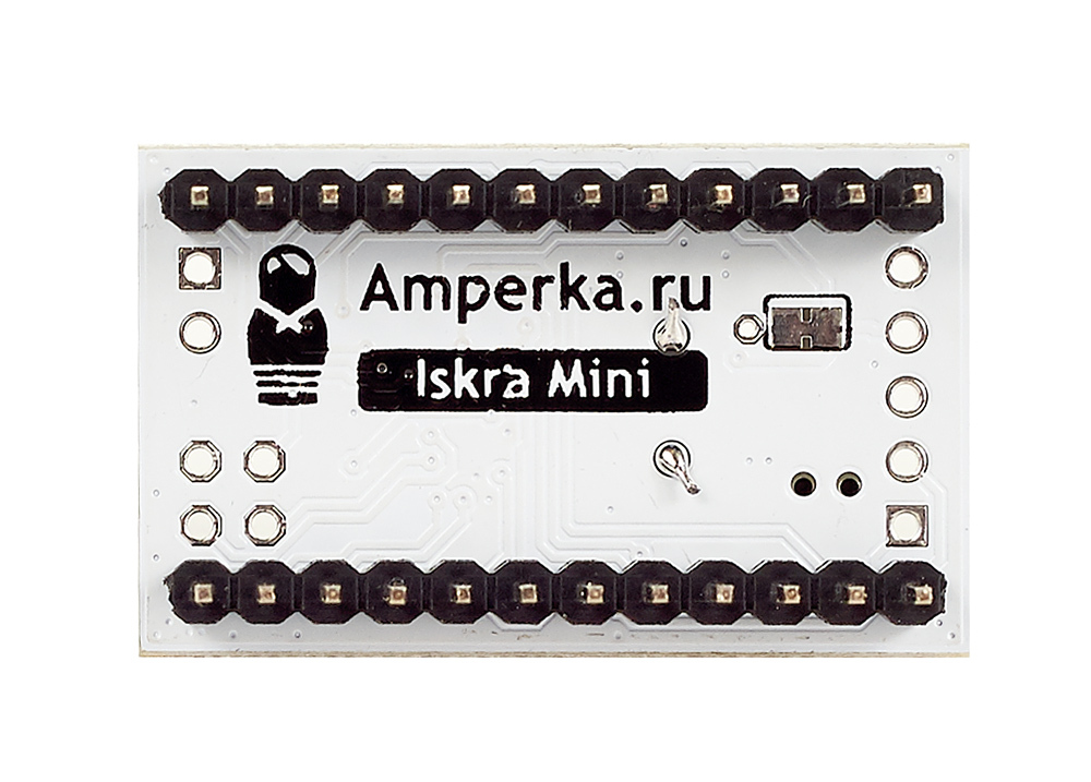 Iskra Mini — полноценная Arduino-платформа, только маленькая: всего 33×20 мм. Если для вашего проекта размер имеет значение, Iskra Mini — правильный выбор.Используйте платформу, чтобы увековечить своё уже работающее Arduino-устройство на макетной плате, чтобы создать недорогую точку в системе из множества микроконтроллеров, или чтобы уместить весь проект в коробке из-под леденцов.В этой версии Iskra Mini мы уже впаяли штырьковые соединители в отверстия пинов. Это упрощает начало работы с платой. Однако, если вам хочется сделать устройство ещё компактнее, выберите Iskra Mini без ног и просто подпаяйте провода к используемым пинам.Iskra Mini сделана на базе такого же микроконтроллера ATmega328, как на популярной Arduino Uno. Плата производится компанией Амперка в России.Подключение и прошивкаIskra Mini программируется в среде Arduino IDE или визуальной среде XOD IDE. Обратите внимание, что на плате нет собственного USB-порта. Поэтому для её прошивки понадобится посредник. Ими могут быть:USB-UART преобразователь;Arduino Uno;ICSP-программатор.Подробнее о том, как подключить и прошить Iskra Mini, читайте в нашей статье на вики.ПитаниеРодной уровень напряжения для Iskra Mini — 5 вольт. На плату мы также установили регулятор напряжения, чтобы можно было подавать любое внешнее напряжение в диапазоне от 5,3 до 9 вольт. Регулятор выдаёт до 150 мА тока. Это делает тривиальным подключение батареек или аккумуляторов.Запитать плату заведомо ровными 5 вольтами можно через любой пин +5V. Произвольным внешним напряжением — через пин VIN.ХарактеристикиМикроконтроллер: ATmega328Тактовая частота: 16 МГцФлеш-память: 32 КБ (2 КБ используются загрузчиком)Оперативная память SRAM: 2 КБЭнергонезависимая память EEPROM: 1 КБРабочее напряжение: 5 ВВходное напряжение: 5–9 ВПортов ввода-вывода общего назначения: 20Портов с поддержкой ШИМ: 6Портов, подключённых к АЦП: 8 (4 из них на нераспаянных выводах)Разрядность АЦП: 10 битАппаратные интерфейсы: UART, SPI, I²C (на нераспаянных выводах)Максимальный ток одного вывода: 40 мАМаксимальный ток с пина +5V: 150 мАГабариты: 33×20 ммРесурсыВидеообзор Iskra Mini:Инструкция по установке, подключению и прошивкеPOV-строка (рисуем в воздухе)Клавиатурный шпион