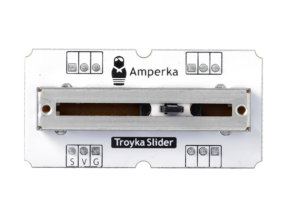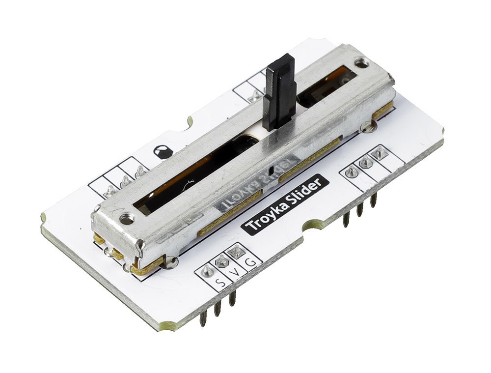 Нужен простой и наглядный способ управлять гаджетами? Плавно регулируй громкость звука, точно смешивай цвета светодиодных лент или настраивай режимы работы климатической установки — точность работы модуля ограничена лишь разрядностью АЦП управляющей платы.Потенциометр очень удобно использовать для ручного задания параметров вроде времени таймера, яркости или контрастности дисплея, скорости вращения двигателя, высоты звука.Слайдер по своей сути — это аналоговый сенсор, который сообщает микроконтроллеру положение бегунка потенциометра. Выходным результатом работы модуля является аналоговый сигнал, с уровнем напряжения прямо пропорциональным перемещению бегунка. В левом положении ручки потенциометр обладает практически нулевым сопротивлением и выдаёт на сигнальный пин S напряжение питания. В правом положении сопротивление максимально — на пине S будет ноль.С модулем просто работать, вам не придётся возиться с пайкой или мелкими компонентами на макетке — всё уже готово.Модуль из серии Troyka Module можно красиво разместить на лицевой панели вашего устройства, прикрутив его винтами М3.ПодключениеСенсор подключается к управляющей электронике через три провода. При подключении к Arduino удобно использовать Troyka Shield. Шлейф для подключения включён в комплект.контакт S — подключите к аналоговому входу микроконтроллераконтакт V — к контакту питанияконтакт G — к землеВозьмите Troyka Slot Shield и избавьтесь от проводов — для надёжной фиксации на шилде мы добавили модулю три дополнительных комплекта ножек.Также модуль физически совместим с breadboard’ом.Комплектациямодуль со слайдеромтрёхпроводной шлейфХарактеристикиТип резистора: линейныйСопротивление: 10 кОмХод ползунка: 30 ммРесурсыВидеообзор слайдеров:Руководство по использованию, примеры и документацияЧто такое Troyka-модули?Библиотека для JS