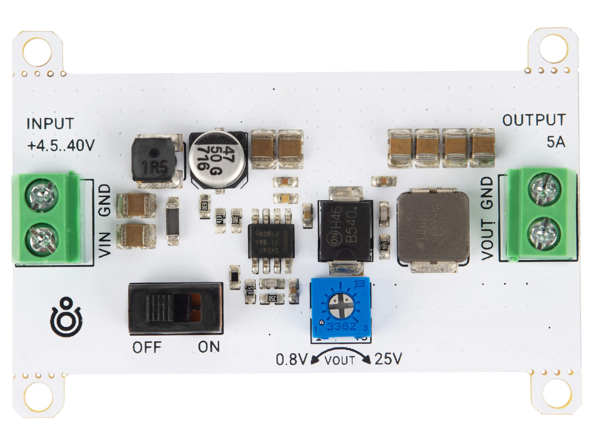 Эффективный понижающий DC-DC-преобразователь на чипе TPS54540 поможет вам безопасно запитать светодиодные ленты и модули, DC-моторы и сервоприводы от различных источников питания до 40 В. Просто подключите нагрузку через Zelo-модуль TPS54540 и установите подходящее рабочее напряжение потенциометром.ОсобенностиМодуль построен на импульсном DC-DC-преобразователе TPS54540 от Texas Instruments с КПД на уровне 90%.Удобный способ запитать ваше устройство с прожорливыми потребителями, если под рукой блок питания DC до 40 В.Выходное напряжение от 0,8 до 25 В регулируется потенциометром.Максимальный выходной ток — 5 А.На модуле предусмотрен физический выключатель, чтобы не приходилось ничего отсоединять.Надёжные винтовые соединения и клеммники Zelo-модуля не подведут, даже если устройство подвергается нагрузкам и тряске.ПодключениеНа модуле понижающего преобразователя расположены два винтовых клеммника.INPUT — входные контакты VIN/GND для подключения источника питания напряжением 4,5–40 В.OUTPUT — выходные контакты VOUT/GND для подключения нагрузки с напряжением 0,8–25 В и током до 5 А.Комплектация1× Плата-модульХарактеристикиПреобразователь DC-DC: TPS54540Частота модуляции напряжения: 100–2500 кГцВходное напряжение: 4,5–40 ВВыходное напряжение: 0,8–25 В (регулируется потенциометром)Максимальный выходной ток: 5 АРазмеры: 66×45×10,6 ммРесурсыИнструкция, примеры использования и документация