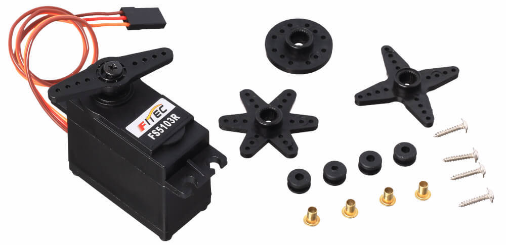 Сервопривод FS5103R позволяет установить и удерживать скорость вращения вала, чтобы моторизовать свои устройства: поворотный стол для фотосъёмки, мобильного робота или радар кругового обзора. Модель FS5103R развивает крутящий момент 3 кг·см и вращается со скоростью до 77 об/мин.Сервопривод поддерживает заданную скорость вращения вала в любом направлении и без ограничений по углу поворота. Стоит рассматривать его, как постоянный мотор, который не требует для работы дополнительного драйвера.ОсобенностиВместе с сервоприводом FS5103R идёт комплект крепежа и пластиковых качелек. Используйте их, чтобы приводить в действие различные механизмы без необходимости искать насадки.Если хочется соединить несколько приводов, либо удобно закрепить один из датчиков или другую механику, обратите внимание на соединительные скобы и алюминиевую втулку на вал.ПодключениеДля работы сервопривода необходим внешний источник питания c напряжением 5 вольт и управляющая плата.Привод подключается шлейфом из трёх проводов:Красный — питание привода.Коричневый — земля.Жёлтый — управляющий сигнал от микроконтроллера.При подключении к Arduino, Iskra JS, STM32 Nucleo и другим платформам, которые совместимы с шилдами форм-фактора Arduino R3, рекомендуем использовать плату расширения Troyka Shield.Чтобы одновременно и точно управлять множеством приводов, не занимая ценные пины контроллера, вам пригодится специальный Multiservo Shield. А для одноплатных компьютеров Raspberry Pi советуем взять Troyka HAT.Работа с сервоприводомДля управления сервоприводом необходимо подавать импульсы в строгие интервалы. Но не переживайте о битах и байтах — воспользуйтесь стандартными библиотеками для работы с сервомоторами:Servo для Arduino.Servo для Raspberry Pi.Servo для Espruino.Читайте подробное руководство по использованию сервоприводов в статье на Wiki.Возможные альтернативыЕсли нужен сервопривод, способный удерживать заданный угол, обратите внимание на FS5106B.Если требуется сервопривод постоянного вращения с большим крутящим моментом, рассмотрите модель FS5113R.Габаритный чертёжКомплектация1× Сервопривод постоянного вращения FS5103R1× Комплект пластиковых насадок1× Комплект крепежаХарактеристикиМодель: Feetech FS5103RСигнал управления: PDM (Pulse-Duration Modulation)Диапазон вращения: 360° (без ограничения)Напряжение питания: 4,8–6 ВКрутящий момент: 3 кг·смСкорость вращения: 77 об/мин (360° за 0,78 сек)Потребляемый ток: 150 мАТок блокировки: 900 мАВнутренний интерфейс: аналоговыйМатериал шестерней: нейлонМатериал корпуса: пластикРазмеры: 54×20×47 ммВес: 36 гРесурсыРуководство по сервоприводам постоянного вращенияБиблиотека для ArduinoБиблиотека для Raspberry PiБиблиотека для EspruinoАвтоматические кормушки для домашних животных