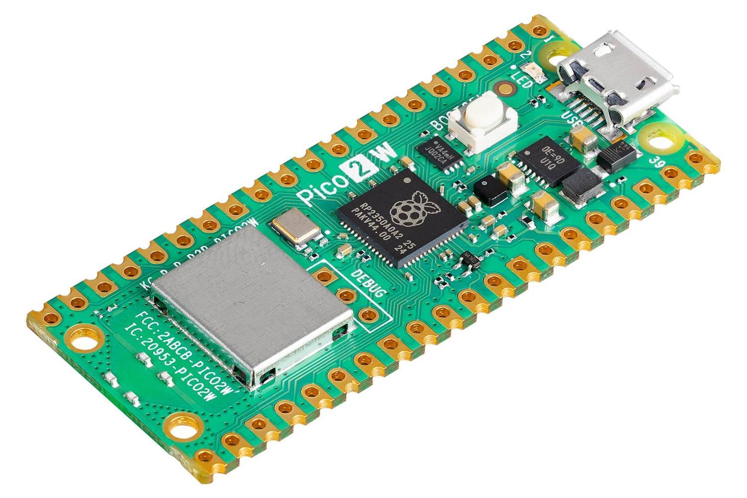 Raspberry Pi Pico 2 W — отладочная плата для разработки на микроконтроллере RP2350 с поддержкой Wi-Fi.В отличие от одноплатных компьютеров, контроллер Raspberry Pi Pico 2 W работает без операционной системы: все ресурсы платформы посвящены выполнению одной программы, которая дирижирует датчиками, модулями и исполнительными устройствами. Поэтому он станет подходящим мозгом для ваших гаджетов, роботов и других изобретений, где важен баланс производительности с низким энергопотреблением.Оптимизированные вычисления с плавающей запятой на 32-битной Raspberry Pi Pico 2 W помогают справиться с комплексными проектами, где не хватило бы мощности и памяти базовых 16-битных Arduino.ОсобенностиСдвоенная архитектура CPU: два вычислительных ядра ARM Cortex-M33 или два ядра RISC-V Hazard3 (150 МГц) на выбор пользователя.Дополнительный чип Infineon CYW43439 с антенной Abracon для беспроводной связи Wi-Fi 802.11n (2,4 ГГц) и Bluetooth 5.2.Программируемый ввод-вывод (PIO) для эмуляции произвольных аппаратных интерфейсов, наподобие SD, DVI или PS/2.ИнтерфейсыПо бокам платы расположены 40 контактов со стандартным шагом 2,54 мм. Чтобы использовать контроллер с макетными платами, вам понадобится припаять к нему штыревую вилку или купить версию с контактными ножками.Для подключения периферии отведено 26 контактов GPIO с дополнительными возможностями.3 входа оснащены 12-битным АЦП для работы с аналоговыми сигналами.24 независимых канала для генерации ШИМ-сигналов на любом GPIO-пине.16 каналов прямого доступа к памяти (DMA) для разгрузки CPU от операций чтения-записи.Для подключения модулей предусмотрены аппаратные интерфейсы UART, SPI и I²C. Программируемый ввод-вывод (PIO) позволяет подружить вашу Pico 2 W с произвольными аппаратными интерфейсами, написав соответствующие подпрограммы для коммуникации через любые из 26 пинов GPIO.Обратите внимание, что к Raspberry Pi Pico 2 W подходят только модули с логическим напряжением 3,3 В. Периферия с логическим напряжением 5 В может повредить устройство!ПрограммированиеRaspberry Pi Pico 2 W программируется с помощью SDK на C/C++ или официального порта MicroPython.Среда программирования Arduino IDE также поддерживает Raspberry Pi Pico 2 W, если установить альтернативное ядро Arduino Pico.ПитаниеКонтроллер питается через разъём micro-USB или контакт VSYS напряжением 1,8–5,5 В.Комплектация1× Плата Raspberry Pi Pico 2 W (без ножек)ХарактеристикиМикроконтроллер: RP2350Вычислительные ядра:2× ARM Cortex-M0+ (32 бита)2× RISC-V Hazard3 (32 бита)Тактовая частота: 150 МГцSRAM-память: 520 КБFlash-память: 4 МБКонтакты GPIO: 26АЦП: 3 входа (12 бит)ШИМ: 24 канала (12 бит)DMA: 16 каналовАппаратные интерфейсы:2× UART2× I²C2× SPIПрограммируемый интерфейс PIO:3 аппаратных блока12 подпрограмм одновременноМодуль беспроводной связи: Infineon CYW43439Wi-Fi 802.11nBluetooth v5.2 с BLEШифрование WPA3SoftAP (до 4 клиентов)Частотный диапазон: 2,4 ГГцНапряжение логических уровней: 3,3 ВНапряжение питания:USB: 5 ВVSYS: 1,8–5,5 ВПотребляемый ток: до 200 мАРазмеры: 52,7×21×3,7 ммРесурсыDatasheet на Raspberry Pi Pico 2 WDatasheet на чип RP2350Datasheet на чип CYW43439Raspberry Pi Pico SDK и примеры кодаДокументация SDK на C/C++Документация SDK на MicroPythonПодключение Raspberry Pi Pico 2 W к интернетуЯдро Arduino Pico с поддержкой Wi-Fi