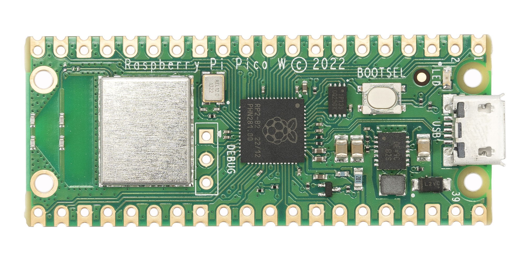 Raspberry Pi Pico W — версия платы с поддержкой Wi-Fi. Микроконтроллер RP2040 с двумя ядрами ARM Cortex-M0+ тактовой частотой 133 МГц станет подходящим мозгом для ваших гаджетов, роботов и других изобретений, где важен баланс производительности с низким энергопотреблением. А дополнительный чип Infineon CYW43439 с антенной Abracon обеспечивает Pico W беспроводную связь Wi-Fi 802.11n (2,4 ГГц) и Bluetooth 5.2.В отличие от одноплатных компьютеров, контроллер Raspberry Pi Pico W работает без операционной системы: все ресурсы платформы посвящены выполнению одной программы, которая дирижирует датчиками, модулями и исполнительными устройствами.Уникальная возможность Pico — программируемый ввод-вывод (Programmable I/O), с которым можно реализовать произвольный аппаратный интерфейс, например шину SD-карты или VGA.Оптимизированные вычисления с плавающей запятой на 32-битной Raspberry Pi Pico W помогают справиться с комплексными проектами, где не хватило бы мощности и памяти базовых 16-битных Arduino.Версия платы без контактных ножек подходит для самых миниатюрных проектов. Для прототипирования на макетной плате пригодится модификация Raspberry Pi Pico W с ногами.Если наличие беспроводной связи в ваших проектах не критично — воспользуйтесь базовой платой Raspberry Pi Pico.ИнтерфейсыПо бокам платы расположены 40 контактов со стандартным шагом 2,54 мм. Чтобы использовать Pico W с макетными платами, вам понадобится припаять к ней штыревую вилку.Для подключения периферии отведено 26 контактов GPIO с дополнительными возможностями.3 входа оснащены 12-битным АЦП для работы с аналоговыми сигналами.16 независимых каналов для генерации ШИМ-сигналов на любом GPIO-пине.12 каналов прямого доступа к памяти (DMA) для разгрузки CPU от операций чтения-записи.Для подключения модулей предусмотрены аппаратные интерфейсы UART, SPI и I²C. Программируемый ввод-вывод (PIO) позволяет подружить вашу Pico W с произвольными аппаратными интерфейсами, написав соответствующие подпрограммы для коммуникации через любые из 26 пинов GPIO.Обратите внимание, что к Raspberry Pi Pico W подходят только модули с логическим напряжением 3,3 В. Периферия с логическим напряжением 5 В может повредить устройство!ПрограммированиеRaspberry Pi Pico W программируется с помощью SDK на C/C++ или официального порта MicroPython.Среда программирования Arduino IDE также поддерживает Raspberry Pi Pico W, если установить альтернативное ядро Arduino Pico.ПитаниеКонтроллер питается через разъём micro-USB или контакт VSYS напряжением 1,8–5,5 В.Комплектация1× Плата Raspberry Pi Pico W (без ножек)ХарактеристикиМикроконтроллер: RP2040Вычислительные ядра: 2× ARM Cortex-M0+ (32 бита)Тактовая частота: 133 МГцSRAM-память: 264 КБFlash-память: 2 МБКонтакты GPIO: 26АЦП: 3 входа (12 бит)ШИМ: 16 каналов (12 бит)DMA: 12 каналовАппаратные интерфейсы:2× UART2× I²C2× SPIПрограммируемый интерфейс PIO:2 аппаратных блока8 подпрограмм одновременноВстроенные периферийные устройства:Часы реального времени (RTC)Датчик температурыМодуль беспроводной связи: Infineon CYW43439Wi-Fi 802.11nBluetooth v5.2 с BLEШифрование WPA3SoftAP (до 4 клиентов)Частотный диапазон: 2,4 ГГцНапряжение логических уровней: 3,3 ВНапряжение питания:USB: 5 ВVSYS: 1,8–5,5 ВПотребляемый ток: до 150 мАРазмеры: 52,7×21×3,7 ммРесурсыИнструкция, примеры использования и документацияDatasheet на Raspberry Pi Pico WDatasheet на чип RP2040Datasheet на чип CYW43439Raspberry Pi Pico SDK и примеры кодаДокументация SDK на C/C++Документация SDK на MicroPythonПодключение Raspberry Pi Pico W к интернетуЯдро Arduino Pico с поддержкой Wi-FiБиблиотека TensorFlow Lite MicroНачало работ