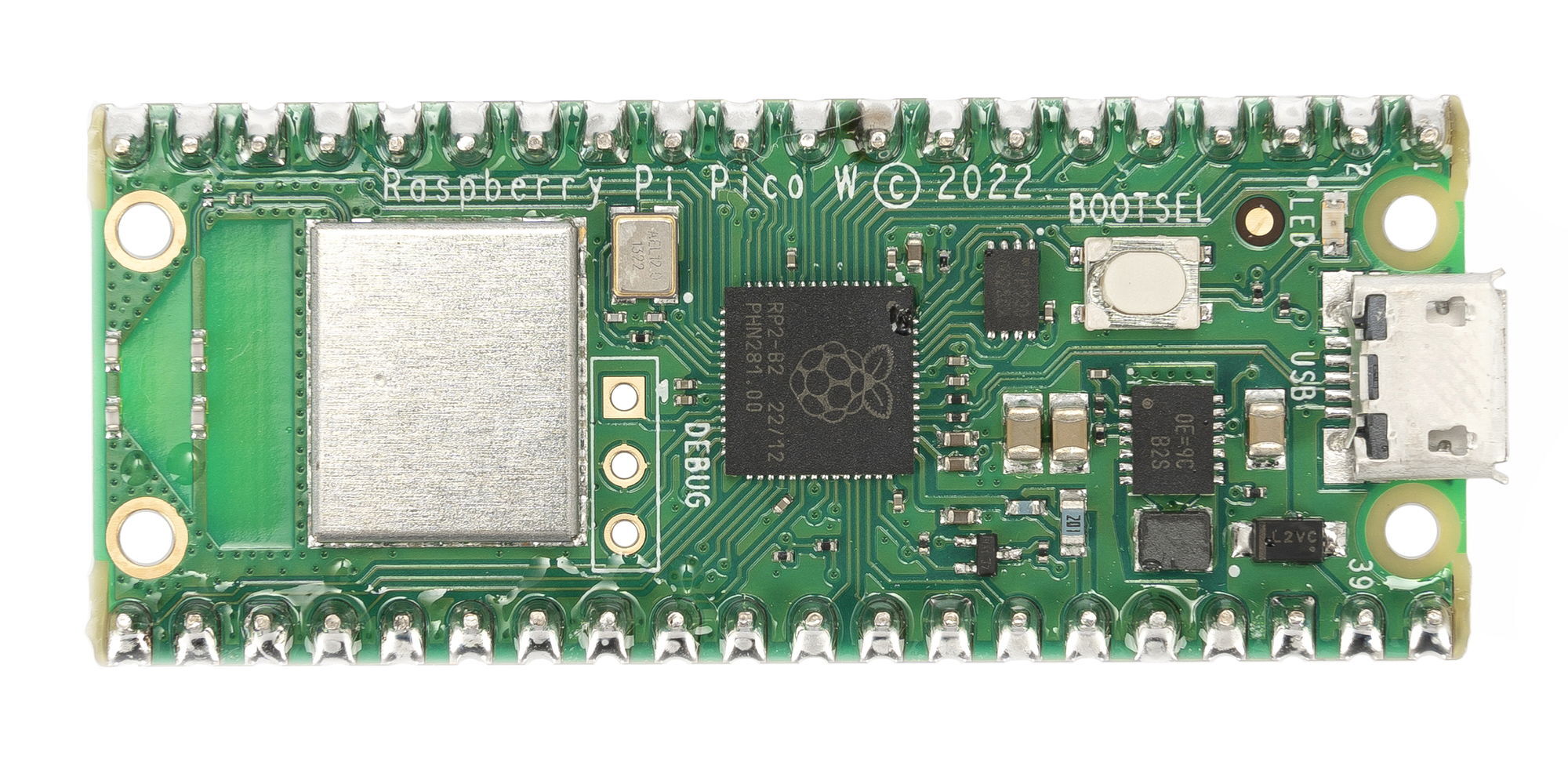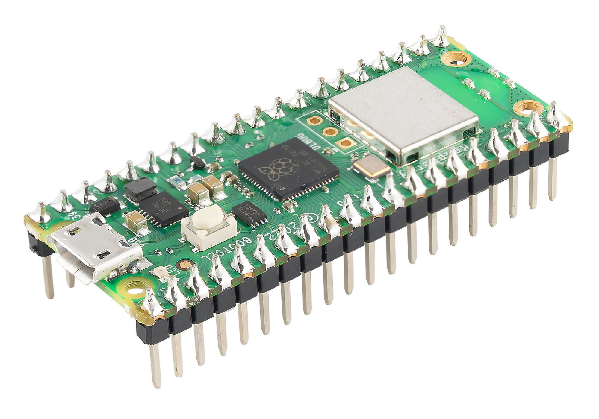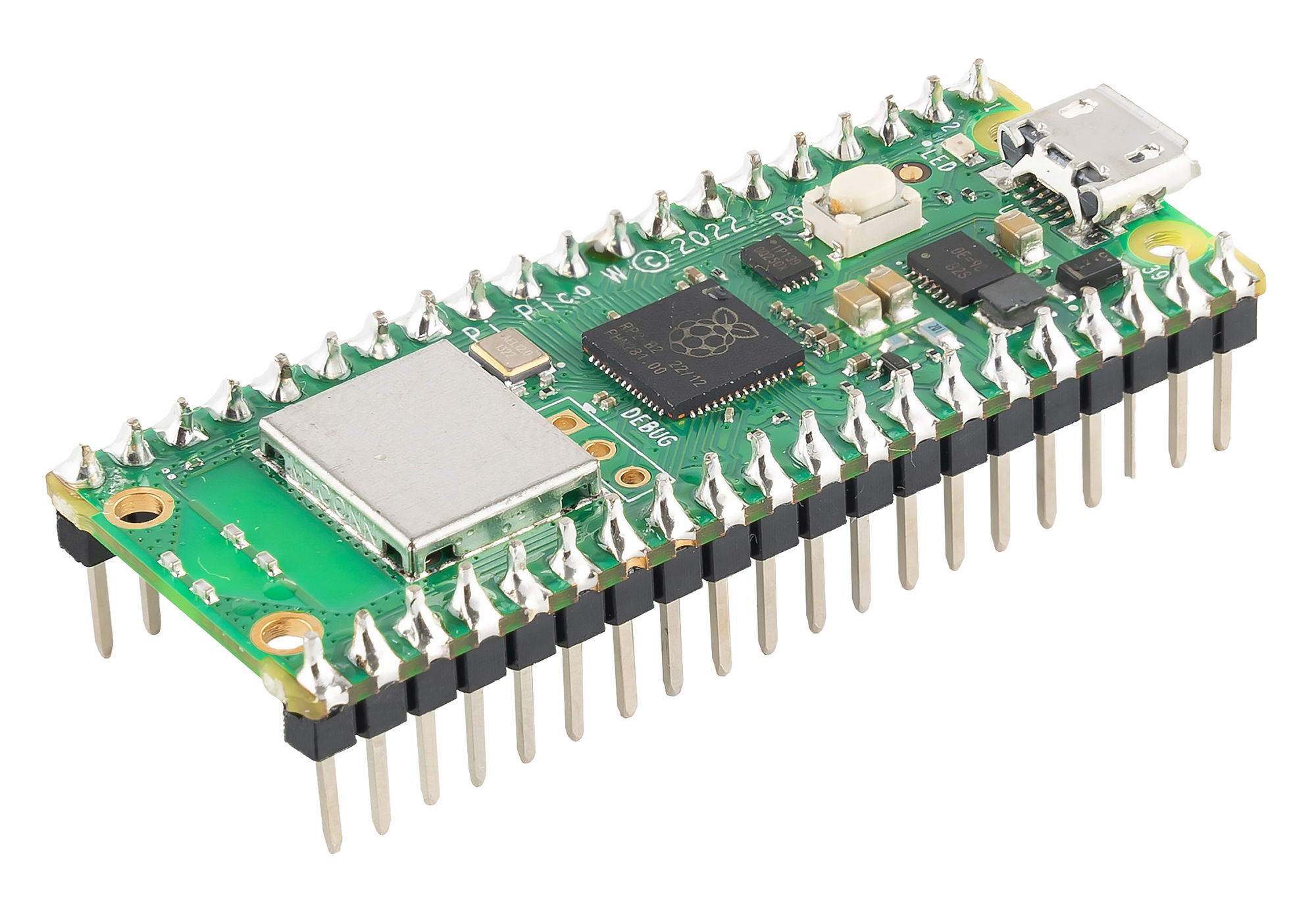 Raspberry Pi Pico W — версия платы с поддержкой Wi-Fi. Микроконтроллер RP2040 с двумя ядрами ARM Cortex-M0+ тактовой частотой 133 МГц станет подходящим мозгом для ваших гаджетов, роботов и других изобретений, где важен баланс производительности с низким энергопотреблением. А дополнительный чип Infineon CYW43439 с антенной Abracon обеспечивает Pico W беспроводную связь Wi-Fi 802.11n (2,4 ГГц) и Bluetooth 5.2.В отличие от одноплатных компьютеров, контроллер Raspberry Pi Pico W работает без операционной системы: все ресурсы платформы посвящены выполнению одной программы, которая дирижирует датчиками, модулями и исполнительными устройствами.Уникальная возможность Pico — программируемый ввод-вывод (Programmable I/O), с которым можно реализовать произвольный аппаратный интерфейс, например шину SD-карты или VGA.Оптимизированные вычисления с плавающей запятой на 32-битной Raspberry Pi Pico W помогают справиться с комплексными проектами, где не хватило бы мощности и памяти базовых 16-битных Arduino.Версия платы с припаянными контактными ножками пригодится для прототипирования на макетной плате. Если нужно сэкономить габариты или встроить плату в устройство, обратите внимание на модификацию Raspberry Pi Pico W без ножек.Если наличие беспроводной связи в ваших проектах не критично — воспользуйтесь базовой платой Raspberry Pi Pico.ИнтерфейсыПо бокам платы расположены 40 контактов со стандартным шагом 2,54 мм и штыревыми вилками, что позволяет собирать прототипы на макетной плате.Для подключения периферии отведено 26 контактов GPIO с дополнительными возможностями.3 входа оснащены 12-битным АЦП для работы с аналоговыми сигналами.16 независимых каналов для генерации ШИМ-сигналов на любом GPIO-пине.12 каналов прямого доступа к памяти (DMA) для разгрузки CPU от операций чтения-записи.Для подключения модулей предусмотрены аппаратные интерфейсы UART, SPI и I²C. Программируемый ввод-вывод (PIO) позволяет подружить вашу Pico W с произвольными аппаратными интерфейсами, написав соответствующие подпрограммы для коммуникации через любые из 26 пинов GPIO.Обратите внимание, что к Raspberry Pi Pico W подходят только модули с логическим напряжением 3,3 В. Периферия с логическим напряжением 5 В может повредить устройство!ПрограммированиеRaspberry Pi Pico W программируется с помощью SDK на C/C++ или официального порта MicroPython.Среда программирования Arduino IDE также поддерживает Raspberry Pi Pico W, если установить альтернативное ядро Arduino Pico.ПитаниеКонтроллер питается через разъём micro-USB или контакт VSYS напряжением 1,8–5,5 В.Комплектация1× Плата Raspberry Pi Pico W (с ножками)ХарактеристикиМикроконтроллер: RP2040Вычислительные ядра: 2× ARM Cortex-M0+ (32 бита)Тактовая частота: 133 МГцSRAM-память: 264 КБFlash-память: 2 МБКонтакты GPIO: 26АЦП: 3 входа (12 бит)ШИМ: 16 каналов (12 бит)DMA: 12 каналовАппаратные интерфейсы:2× UART2× I²C2× SPIПрограммируемый интерфейс PIO:2 аппаратных блока8 подпрограмм одновременноВстроенные периферийные устройства:Часы реального времени (RTC)Датчик температурыМодуль беспроводной связи: Infineon CYW43439Wi-Fi 802.11nBluetooth v5.2 с BLEШифрование WPA3SoftAP (до 4 клиентов)Частотный диапазон: 2,4 ГГцНапряжение логических уровней: 3,3 ВНапряжение питания:USB: 5 ВVSYS: 1,8–5,5 ВПотребляемый ток: до 150 мАРазмеры: 52,7×21×8,7 ммРесурсыИнструкция, примеры использования и документацияDatasheet на Raspberry Pi Pico WDatasheet на чип RP2040Datasheet на чип CYW43439Raspberry Pi Pico SDK и примеры кодаДокументация SDK на C/C++Документация SDK на MicroPythonПодключение Raspberry Pi Pico W к интернетуЯдро Arduino Pico с поддержк
