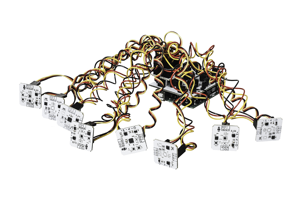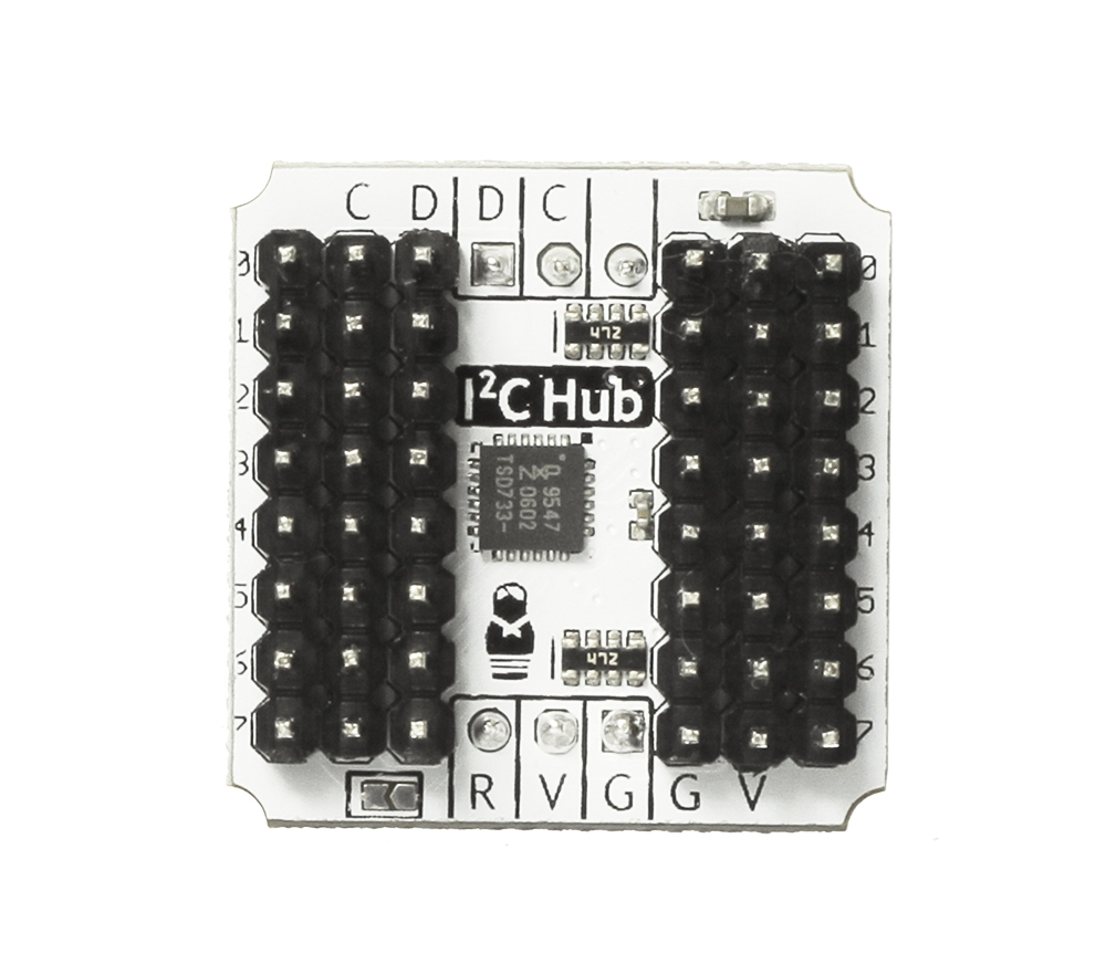 Забудьте о конфликтах I²C модулей с одинаковыми адресами. Используйте несколько IMU-сенсоров для управления квадрокоптером, отслеживайте жесты с помощью группы датчиков приближения или постройте широкоформатный дисплей на светодиодных матрицах.Принцип работыI²C хаб похож на галетный переключатель в старом телевизоре или железнодорожную стрелку. К устройству подключается несколько управляемых модулей (Slave), но в каждый момент времени активно только одно (Master). Если хотите порботать с другим модулем, необходимо «переключить канал».ПодключениеНа модуле выведено две пары Troyka-контактов.Нижняя группаСигнальный (R) — сигнал сброса микросхемы управления PCA9547. Подключите к цифровому пину микроконтроллера. По умолчанию пин отключён от чипа.Питание (V) — соедините с рабочим напряжением микроконтроллера.Земля (G) — Соедините с пином GND микроконтроллера.Верхняя группаСигнальный (D) — пин данных шины I²C. Подключите к SDA пину микроконтроллера.Сигнальный (C) — пин тактирования шины I²C. Подключите к SCL пину микроконтроллераДля подключения к платам Arduino и Iskra JS используйте плату расширения Troyka Shield. А с Troyka Slot Shield забудьте о проводах вовсе.ПрограммированиеХаб общается с управляющей электроникой по шине I²C. Но вы можете не переживать о битах и байтах. Мы написали библиотеку TroykaI2CHub для Arduino, благодаря которой общение с модулем несложнее мигания светодиодом.Комплектация1× плата сенсор2× трёхпроводных шлейфаХарактеристикиНапряжение питания: 3.3–5 ВИнтерфейс на вход: I²CАдрес модуля по умолчанию: 0x70Интерфейс на выход: восемь дополнительных каналов I²CГабариты: 25,4×25,4 ммРесурсыВидеообзор модуля:Руководство по использованию, примеры и документацияЧто такое Troyka-модули?Библиотека для Arduino