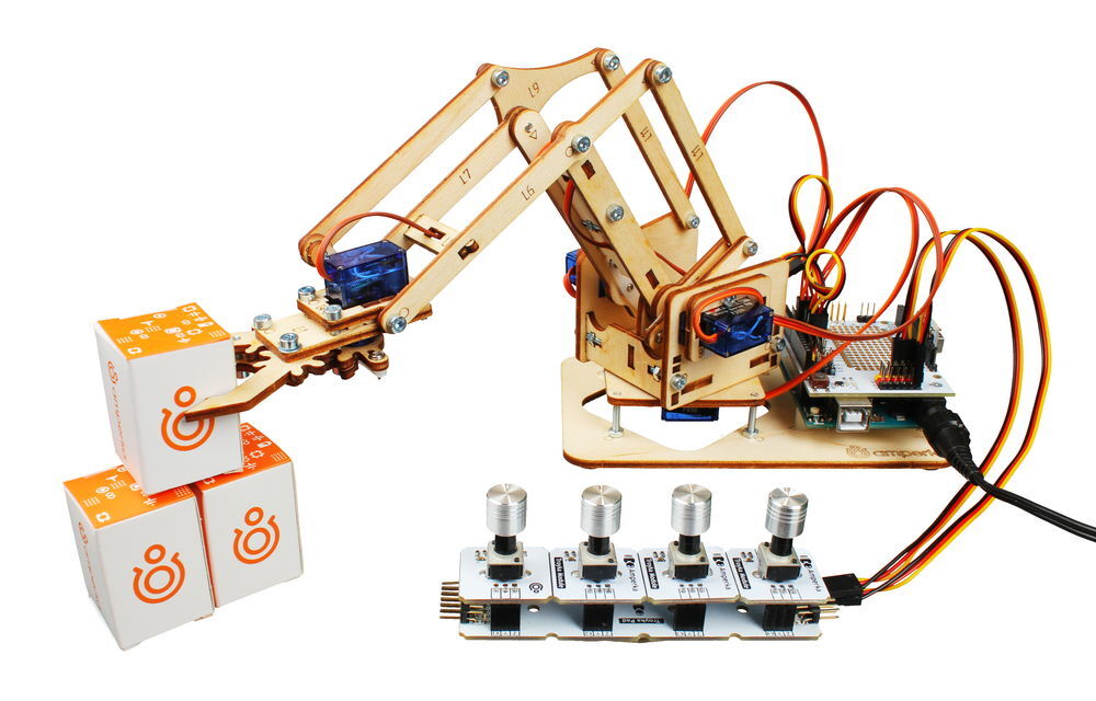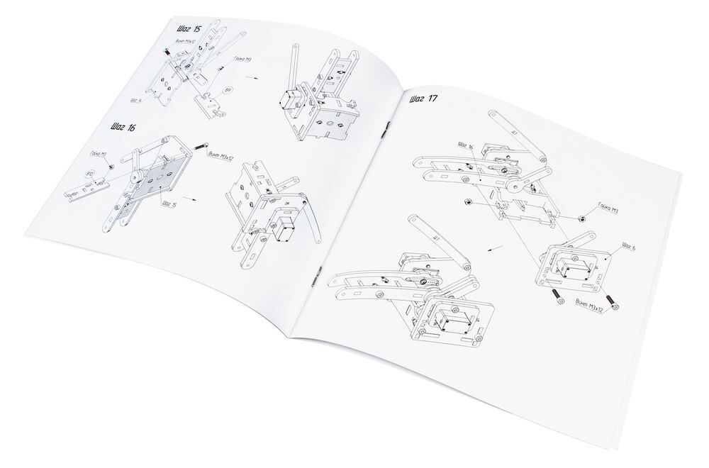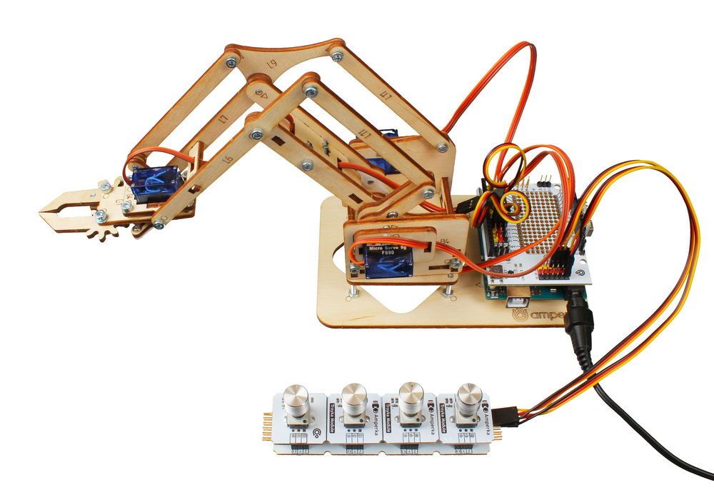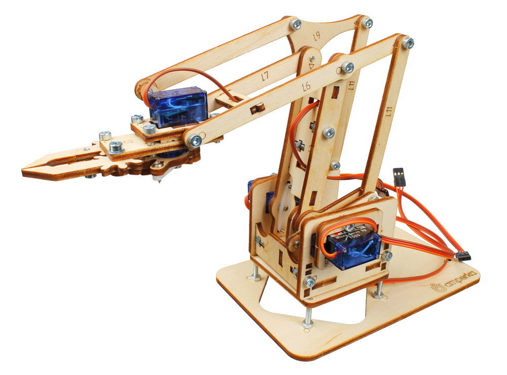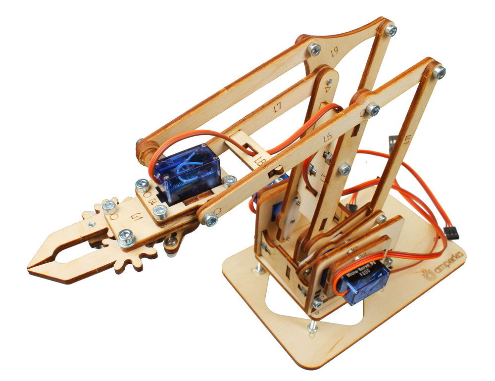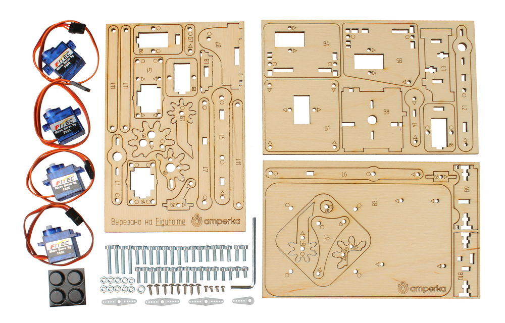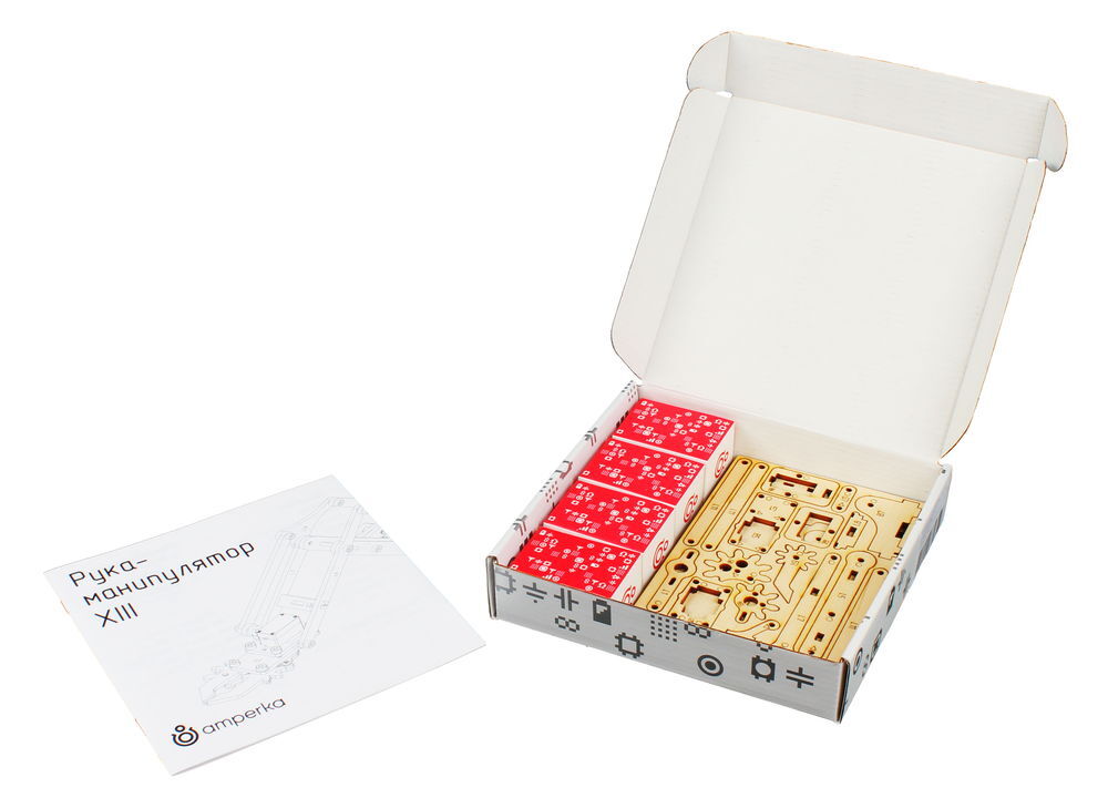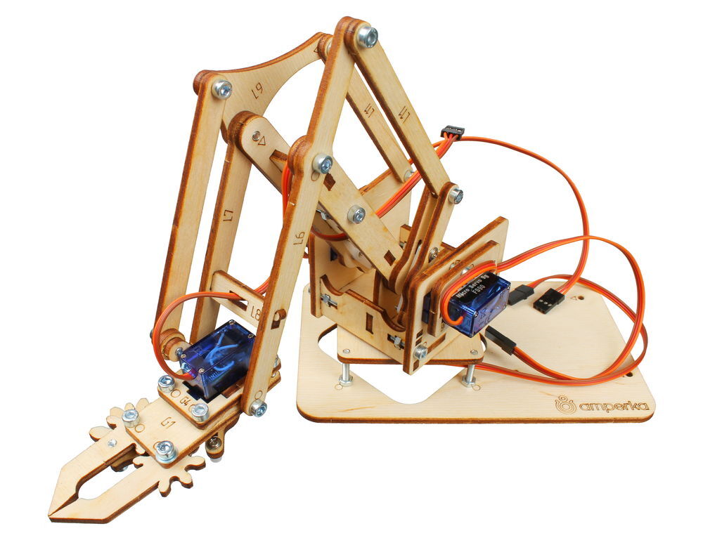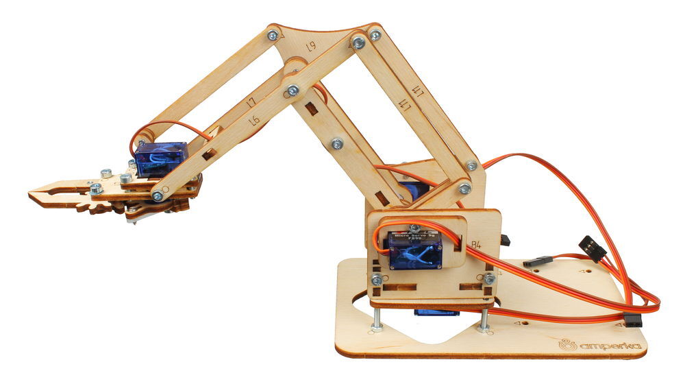 Превратите свой стол в полигон для робототехники! Перетаскивайте предметы, экспериментируйте с управлением сервами или стильно играйте в шахматы с помощью роботизированной руки-манипулятора! 🦾В комплект входят детали из фанеры и сервоприводы, необходимые для сборки электромеханической части руки. Добавьте к ней управляющую плату по вкусу, и вы получите готовое устройство с мозгом, который можно запрограммировать и прикрутить разные средства управления.ОсобенностиНедорогой способ приобщиться к робототехнике, вести занятия в кружках или устраивать соревнования.Робо-рука легко собирается из фанерных деталей, как конструктор.Резиновые ножки предотвращают скольжение платформы.Суставами и захватом управляют четыре сервопривода Feetech FS90 с крутящим моментом до 1,3 кг·см.Доступное программирование через готовые библиотеки для серво.Совместимость с любыми контроллерами, у которых есть 4 пина GPIO.Высокоточная лазерная нарезка деталей из фанеры происходит на мощностях сервиса Figuro.За основу для робо-руки мы взяли Open Source-проект MeArm. Воспользуйтесь чертежами-исходниками, если хотите кастомизировать проект под свои нужды или нарезать запчасти.ПодключениеЧтобы управлять роботизированной рукой, вам понадобится контроллер. Например, подойдёт традиционный Arduino Uno / Iskra Uno или Iskra JS. Для удобного подключения четырёх серво вместе с органами управления пригодится плата расширения Troyka Shield.Если же вы хотите рулить робо-рукой программно и разгрузить основной контроллер, можно обойтись платой Multiservo Shield.УправлениеРучное управление делает гаджет веселее! Возьмите четыре Troyka-потенциометра, чтобы рулить поворотом каждого сустава руки.ПитаниеДля стабильной работы контроллера и всех сервоприводов подойдёт блок питания на 5 В / 2 А.При этом на контактные колодки Troyka Shield / Multiservo Shield нужно установить понижающий преобразователь питания, который будет поддерживать стабильное напряжение 5 В без перегрева штатного регулятора на Arduino.ПрограммированиеДля быстрого старта воспользуйтесь визуальной средой программирования XOD IDE. Мы сделали готовый демо-проект на XOD, который позволит вам рулить сервоприводами робо-руки при помощи четырёх потенциометров.В общем случае для программного управления рукой-манипулятором вам нужно командовать сервоприводами через готовые библиотеки:Servo для ArduinoServo для Raspberry PiServo для EspruinoОсобенности управления сервоприводами и примеры работы вы найдёте в руководстве на нашей Wiki.Комплектация1× Детали основания (нарезка из фанеры)1× Детали суставов (нарезка из фанеры)1× Детали захвата (нарезка из фанеры)4× Микросервопривод Feetech FS901× Комплект крепежа4× Резиновая ножкаОбратите внимание, что в комплект входит только электромеханическая рука-манипулятор. Управляющая плата приобретается отдельно.ХарактеристикиМодель: Amperka Рука-манипулятор XIII (AMP-S063)Сервоприводы: Feetech FS90 / 180° (4 шт.)Подключение: макетные провода «мама»Напряжение питания: 5 ВМаксимальный потребляемый ток: 2 АРазмеры манипулятора: 20×9×18 смВес в собранном виде: 160 гРесурсыИнструкция для сервоприводов Feetech FS90Управление сервоприводами с удержанием углаБиблиотека для ArduinoБиблиотека для Raspberry PiБиблиотека для EspruinoИсходные чертежи для лазерной резки (DXF)Среда программирования XOD IDEПример программы на XOD