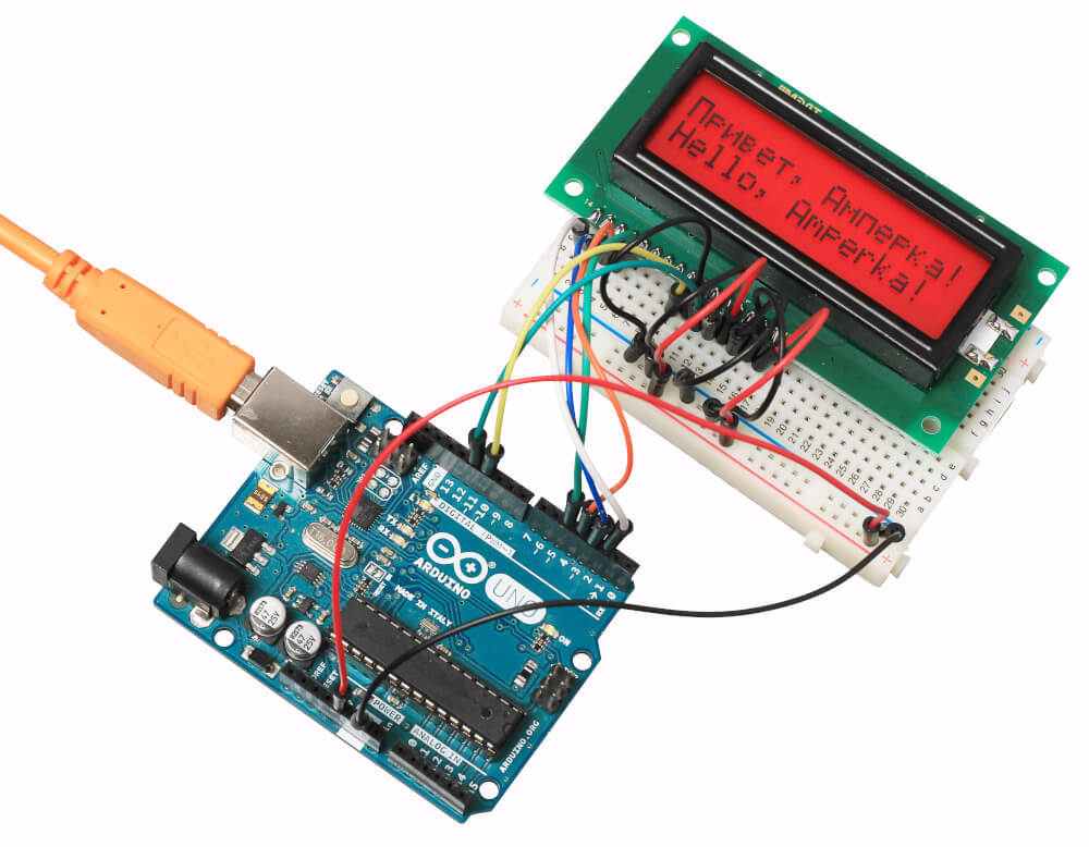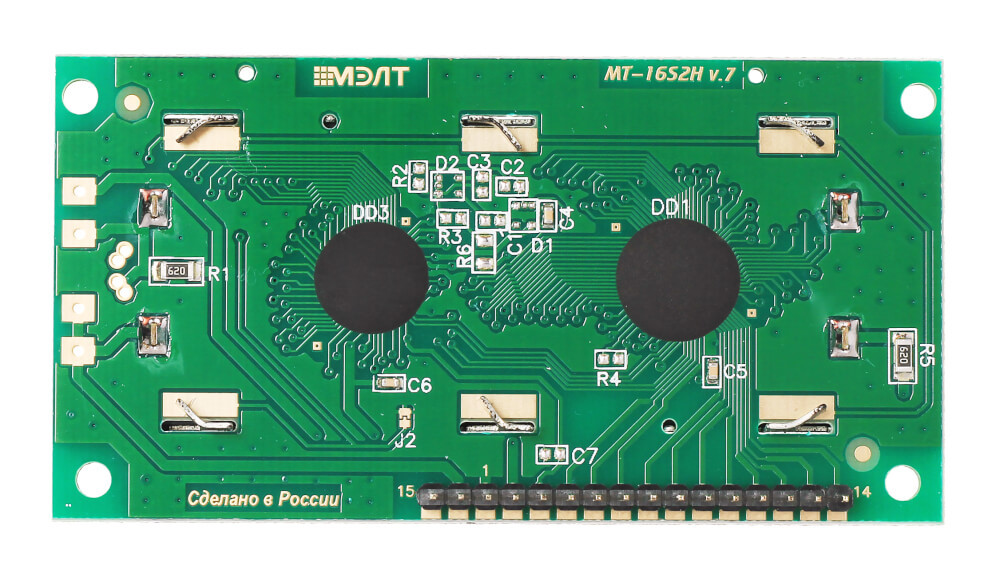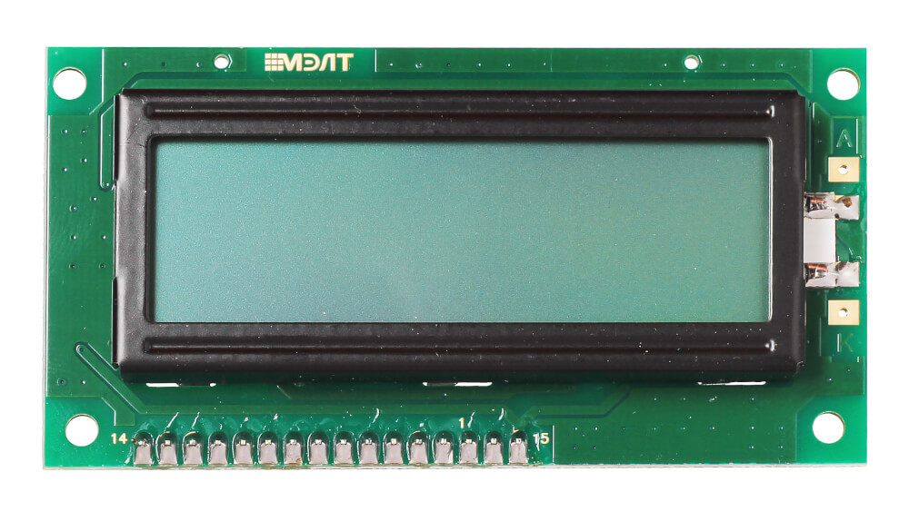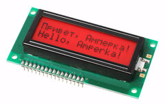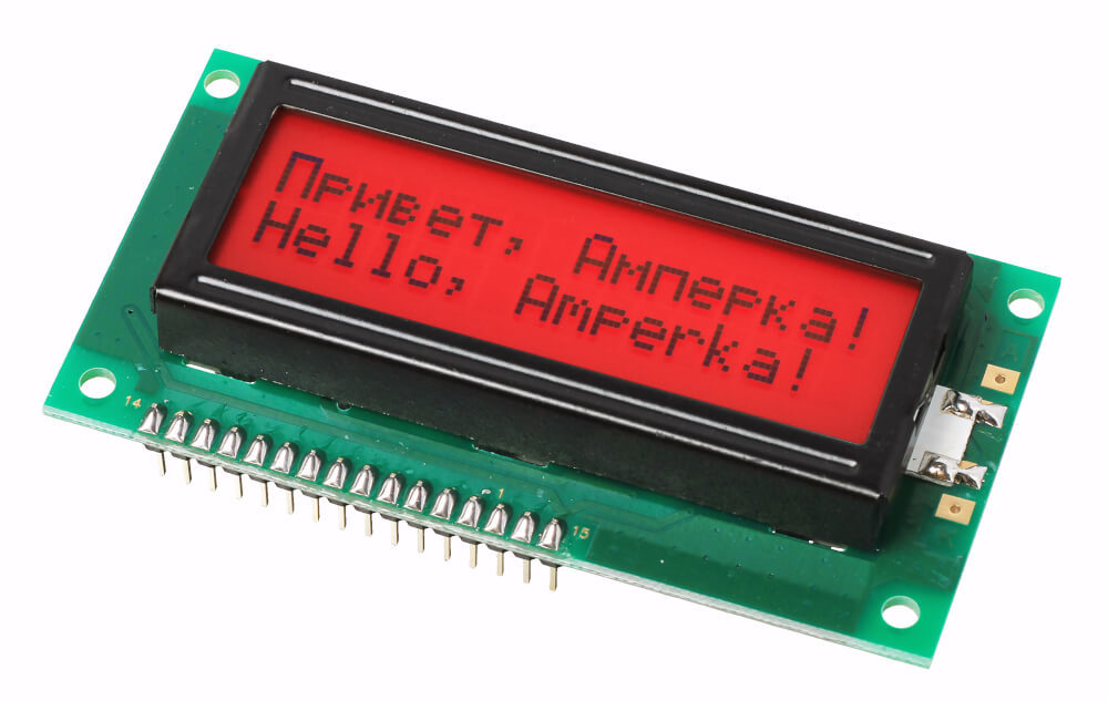 Текстовый ЖК-экран на две строки по 16 символов подойдёт для создания интерфейса вашего устройства или отображения показаний датчиков.НачинкаLCD-дисплей MT-16S2H компании МЭЛТ умеет выводить латиницу, кириллицу и набор зашитых типографских знаков. Знакогенератор также позволяет создать 8 собственных символов. На красном фоне экрана выводятся чёрные символы размером 5×8 точек — похожие дисплеи встречаются, например, в вендинговых аппаратах и турникетах общественного транспорта.Дисплей управляется чипом Ангстрем КБ1013ВГ6, аналогичным Hitachi HD44780, который является стандартом де-факто для знакосинтезирующих LCD-дисплеев. Это даёт полную совместимость с зарубежными моделями экранов.Встроенная LED-подсветка экрана включается подачей питания на соответствующие пины.ПодключениеТекстовый дисплей подключается к управляющей электронике через 16 контактов. Смотрите полную распиновку с примерами подключения в инструкции на нашей Wiki.Для удобного прототипирования вам пригодится макетная плата c соединительными проводами «папа-папа».ПрограммированиеДля работы с дисплеем существуют готовые библиотеки для Arduino IDE и визуальной среды программирования XOD IDE. Также им можно управлять в среде Espruino Web IDE или Raspbian.Комплектация1× Знакосинтезирующий дисплейХарактеристикиМодель: МЭЛТ MT-16S2H-2FLRТип дисплея: жидкокристаллический (LCD)Тип подсветки: светодиодная (LED)Индикация: 2 строки по 16 символовЦвет: монохромныйЦвет символов: чёрныйЦвет фона: красныйДрайвер матрицы: Ангстрем КБ1013ВГ6Интерфейс: параллельный 4/8 битНапряжение питания: 5 ВМаксимальный ток потребления: 1 мАПотребляемый ток подсветки: 100 мАНапряжение логических уровней: 3,3–5 ВГабариты: 84×44×13 ммРесурсыВидеообзор линейки текстовых экранов МЭЛТ:Инструкция по применению, примеры и документацияВстроенная библиотека Arduino IDEБиблиотека для Arduino с поддержкой русскогоБиблиотека для XOD IDEБиблиотека для Iskra JSТестер батареек