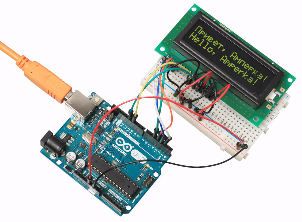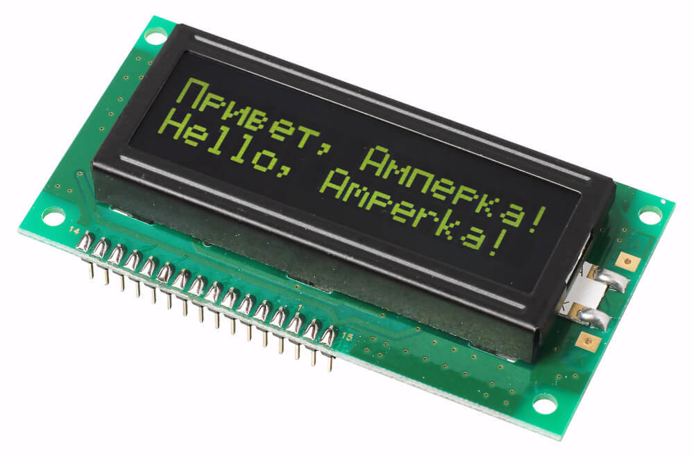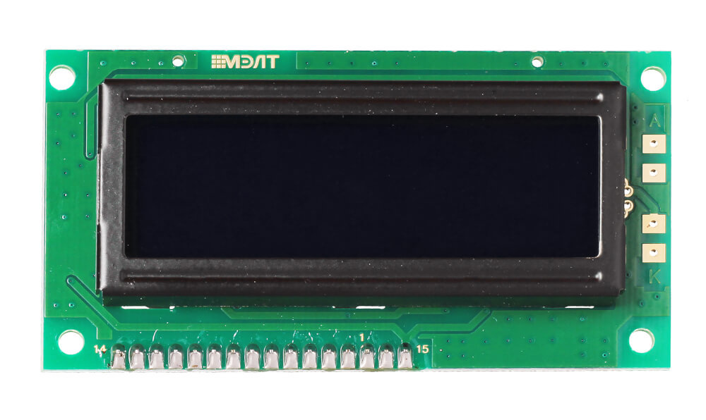Текстовый ЖК-экран на две строки по 16 символов подойдёт для создания интерфейса вашего устройства или отображения показаний датчиков.НачинкаLCD-дисплей MT-16S2H компании МЭЛТ умеет выводить латиницу, кириллицу и набор зашитых типографских знаков. Знакогенератор также позволяет создать 8 собственных символов. На чёрном фоне экрана выводятся зелёные символы размером 5×8 точек — похожие дисплеи встречаются, например, в вендинговых аппаратах и турникетах общественного транспорта.Дисплей управляется чипом Ангстрем КБ1013ВГ6, аналогичным Hitachi HD44780, который является стандартом де-факто для знакосинтезирующих LCD-дисплеев. Это даёт полную совместимость с зарубежными моделями экранов.Встроенная LED-подсветка экрана включается подачей питания на соответствующие пины.ПодключениеТекстовый дисплей подключается к управляющей электронике через 16 контактов. Смотрите полную распиновку с примерами подключения в инструкции на нашей Wiki.Для удобного прототипирования вам пригодится макетная плата c соединительными проводами «папа-папа».ПрограммированиеДля работы с дисплеем существуют готовые библиотеки для Arduino IDE и визуальной среды программирования XOD IDE. Также им можно управлять в среде Espruino Web IDE или Raspbian.Комплектация1× Знакосинтезирующий дисплейХарактеристикиМодель: МЭЛТ MT-16S2H-2VLGТип дисплея: жидкокристаллический (LCD)Тип подсветки: светодиодная (LED)Индикация: 2 строки по 16 символовЦвет: монохромныйЦвет символов: зелёныйЦвет фона: чёрныйДрайвер матрицы: Ангстрем КБ1013ВГ6Интерфейс: параллельный 4/8 битНапряжение питания: 5 ВМаксимальный ток потребления: 1 мАПотребляемый ток подсветки: 100 мАНапряжение логических уровней: 3,3–5 ВГабариты: 84×44×13 ммРесурсыВидеообзор линейки текстовых экранов МЭЛТ:Инструкция по применению, примеры и документацияВстроенная библиотека Arduino IDEБиблиотека для Arduino с поддержкой русскогоБиблиотека для XOD IDEБиблиотека для Iskra JSТестер батареек