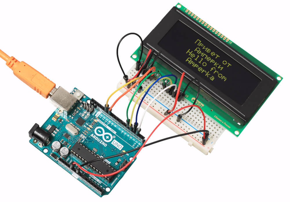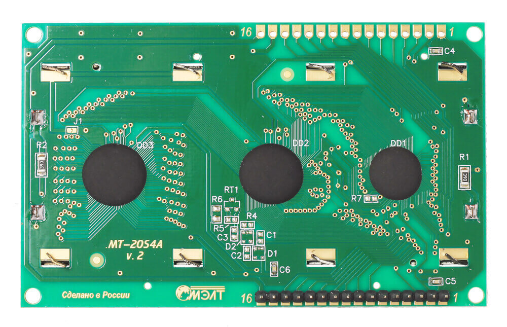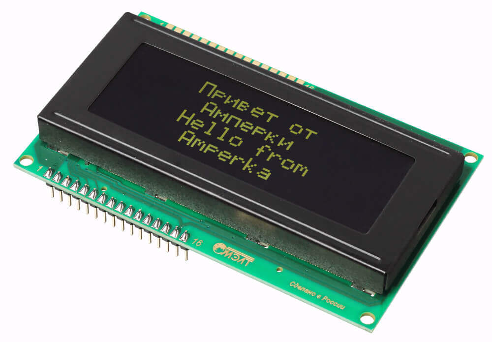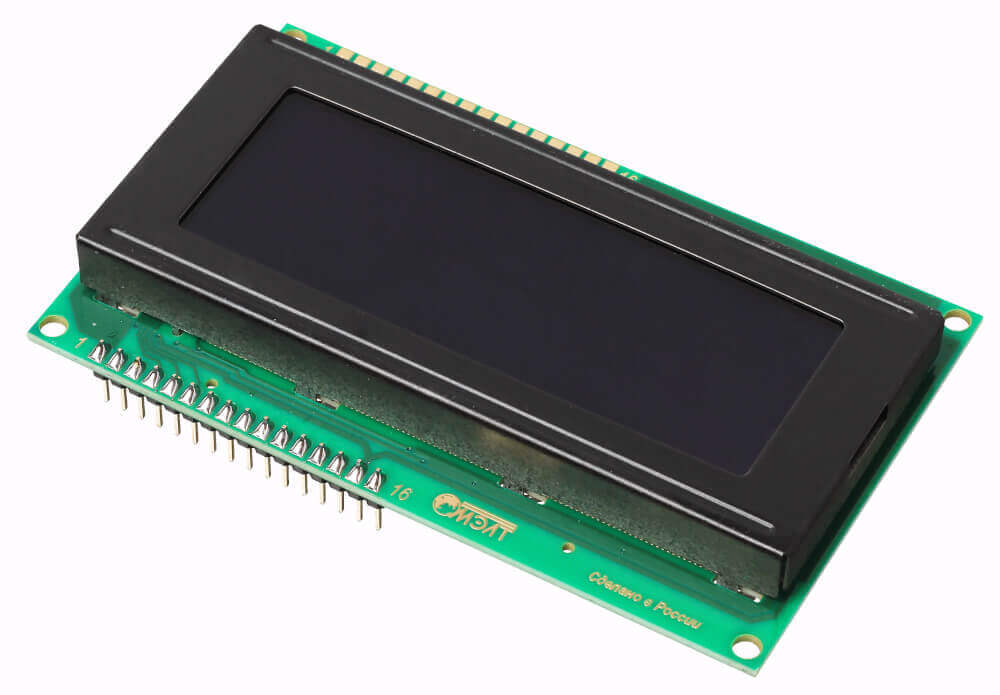 Большой текстовый ЖК-экран на четыре строки по 20 символов подойдёт для вывода подробного меню с интерфейсом вашего устройства и отображения показаний датчиков.НачинкаLCD-дисплей MT-20S4A компании МЭЛТ умеет выводить латиницу, кириллицу и набор зашитых типографских знаков. Знакогенератор также позволяет создать 8 собственных символов. На чёрном фоне экрана выводятся зелёные символы размером 5×8 точек — похожие дисплеи встречаются, например, в вендинговых аппаратах и турникетах общественного транспорта.Дисплей управляется чипом Ангстрем КБ1013ВГ6, аналогичным Hitachi HD44780, который является стандартом де-факто для знакосинтезирующих LCD-дисплеев. Это даёт полную совместимость с зарубежными моделями экранов.Встроенная LED-подсветка экрана включается подачей питания на соответствующие пины.ПодключениеТекстовый дисплей подключается к управляющей электронике через 16 контактов. Смотрите полную распиновку с примерами подключения в инструкции на нашей Wiki.Для удобного прототипирования вам пригодится макетная плата c соединительными проводами «папа-папа».ПрограммированиеДля работы с дисплеем существуют готовые библиотеки для Arduino IDE и визуальной среды программирования XOD IDE. Также им можно управлять в среде Espruino Web IDE или Raspbian.Комплектация1× Знакосинтезирующий дисплейХарактеристикиМодель: МЭЛТ MT-20S4A-2VLGТип дисплея: жидкокристаллический (LCD)Тип подсветки: светодиодная (LED)Индикация: 4 строки по 20 символовЦвет: монохромныйЦвет символов: зелёныйЦвет фона: чёрныйДрайвер матрицы: Ангстрем КБ1013ВГ6Интерфейс: параллельный 4/8 битНапряжение питания: 5 ВМаксимальный ток потребления: 1,4 мАПотребляемый ток подсветки: 120 мАНапряжение логических уровней: 3,3–5 ВГабариты: 98×60×13 ммРесурсыВидеообзор линейки текстовых экранов МЭЛТ:Инструкция по применению, примеры и документацияВстроенная библиотека Arduino IDEБиблиотека для Arduino с поддержкой русскогоБиблиотека для XOD IDEБиблиотека для Iskra JS
