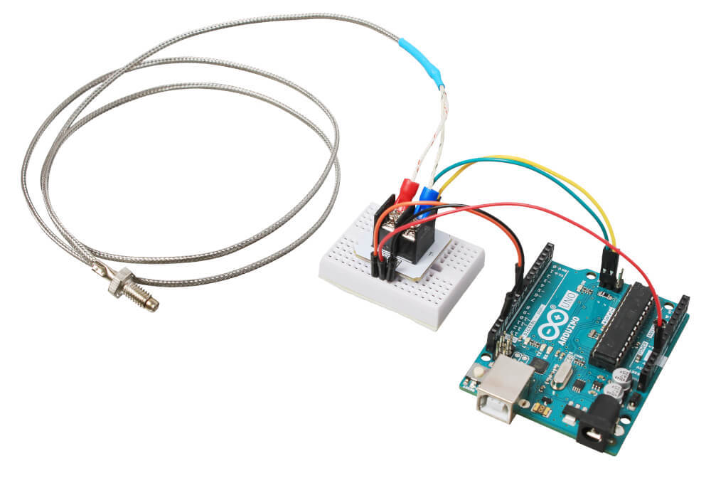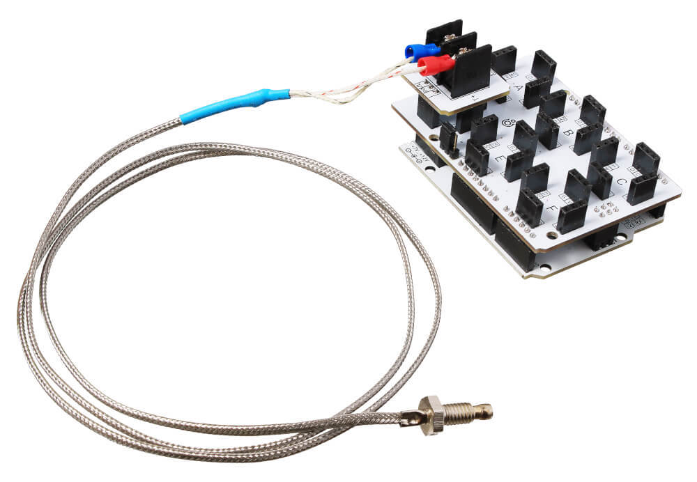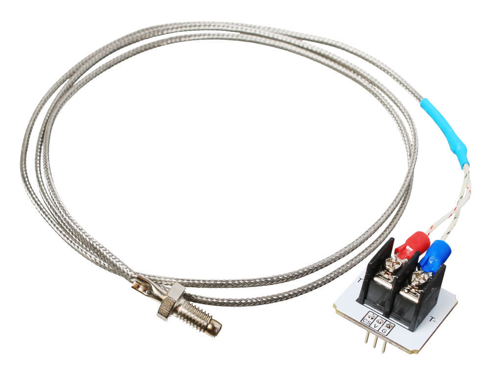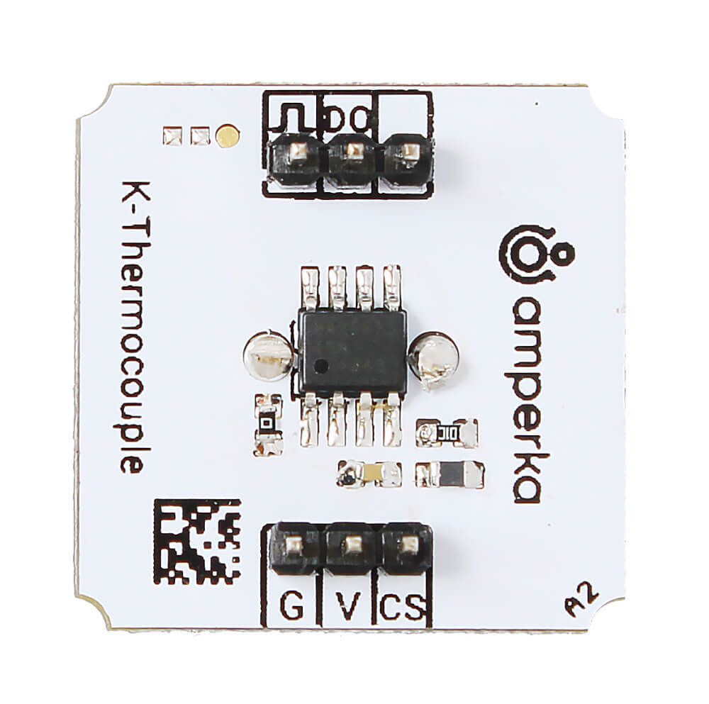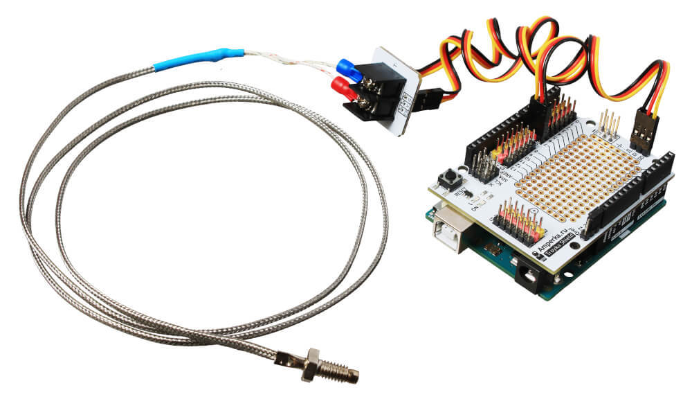 Термопара типа K — универсальный жаропрочный термометр, который поможет вам измерить температуру там, где обычный твердотельный датчик просто расплавится: хоть в бойлере, хоть в духовом шкафу с температурой до 1000 °С, хоть на концерте Rammstein.Смело используйте термопару в своих самых горячих и зажигательных проектах, которые не по зубам обычным датчикам температуры вроде DS18B20.ОсобенностиШирокий диапазон измерения температуры от 0 °С до 600 °С с точностью ±2 °С.Возможен кратковременный нагрев до 1000 °С (на 3–5 минут) ценой ускоренного температурного старения электродов.Цифровой усилитель/преобразователь сигнала MAX6675 с компенсацией температуры холодного конца термопары.12-битный цифровой сигнал с разрешением 0,25 °С.Интерфейс SPI для подключения к управляющим платам.Измерительный зонд (точка горячего спая) надёжно крепится на стандартную резьбу М6.При контакте термопары со средой с избытком серы или свободного кислорода постепенно возникает химическая деградация электродов.Принцип работыТермопара работает за счёт термоэлектрического эффекта, который также называют эффектом Зеебека. Он заключается в том, что на концах разнородных проводников при последовательном соединении возникает электродвижущая сила (ЭДС), пропорциональная разнице температур между контактами. Зная характеристики материалов, можно построить зависимость и вычислить температуру по показаниям вольтметра, подключённого к термопаре.В нашем Troyka-модуле используется самая распространённая термопара типа K (ТХА, хромель-алюмель), которая обладает достаточно линейной характеристикой в рабочем диапазоне температур. Микросхема MAX6675 усиливает полезный сигнал и делает цифровое преобразование с 12-битной точностью, чтобы вы могли легко использовать термопару в своих DIY-проектах.ПодключениеТермопара прикручивается к клеммнику на модуле обработки, который подключается к управляющим платам через две группы Troyka-контактов.Верхняя группаСигнальный (SCK) — линия тактирования интерфейса SPI (Serial Clock).Сигнальный (DO) — линия передачи данных интерфейса SPI (Data Output).Нижняя группаСигнальный (CS) — выбор ведомого устройства в интерфейсе SPI (Chip Select).Питание (V) — питание сенсора (3,3–5 В).Земля (G) — общая земля.При подключении к Arduino или Iskra JS удобно использовать Troyka Shield, а для одноплатных компьютеров Raspberry Pi пригодится Troyka HAT. Полностью избавиться от проводов вам поможет плата расширения Troyka Slot Shield. Контактные ножки модуля также совместимы с breadboard’ом.Комплектация1× Термопара с кабелем1× Плата-модуль2× Трёхпроводной шлейфХарактеристикиТип термопары: К (ТХА)Материал электродов: хромель/алюмельДиапазон измерений температуры: 0…+600 °СТочность измерения температуры: ±2 °СЧувствительность термопары: 40 мВ/°CРезьба крепления: М6Матерал крепления: нержавеющая стальТип кабеля: экранированный с металлической оплёткойДлина кабеля: 1 мЦифровой усилитель/преобразователь: MAX6675Сигнал датчика: цифровой (12 бит)Интерфейс: SPIНапряжение питания: 3,3–5 ВПотребляемый ток: 0,7 мАРазмеры модуля: 25,4×25,4×25 ммРесурсыИнструкция по использованию, примеры и документацияЧто такое Troyka-модули?