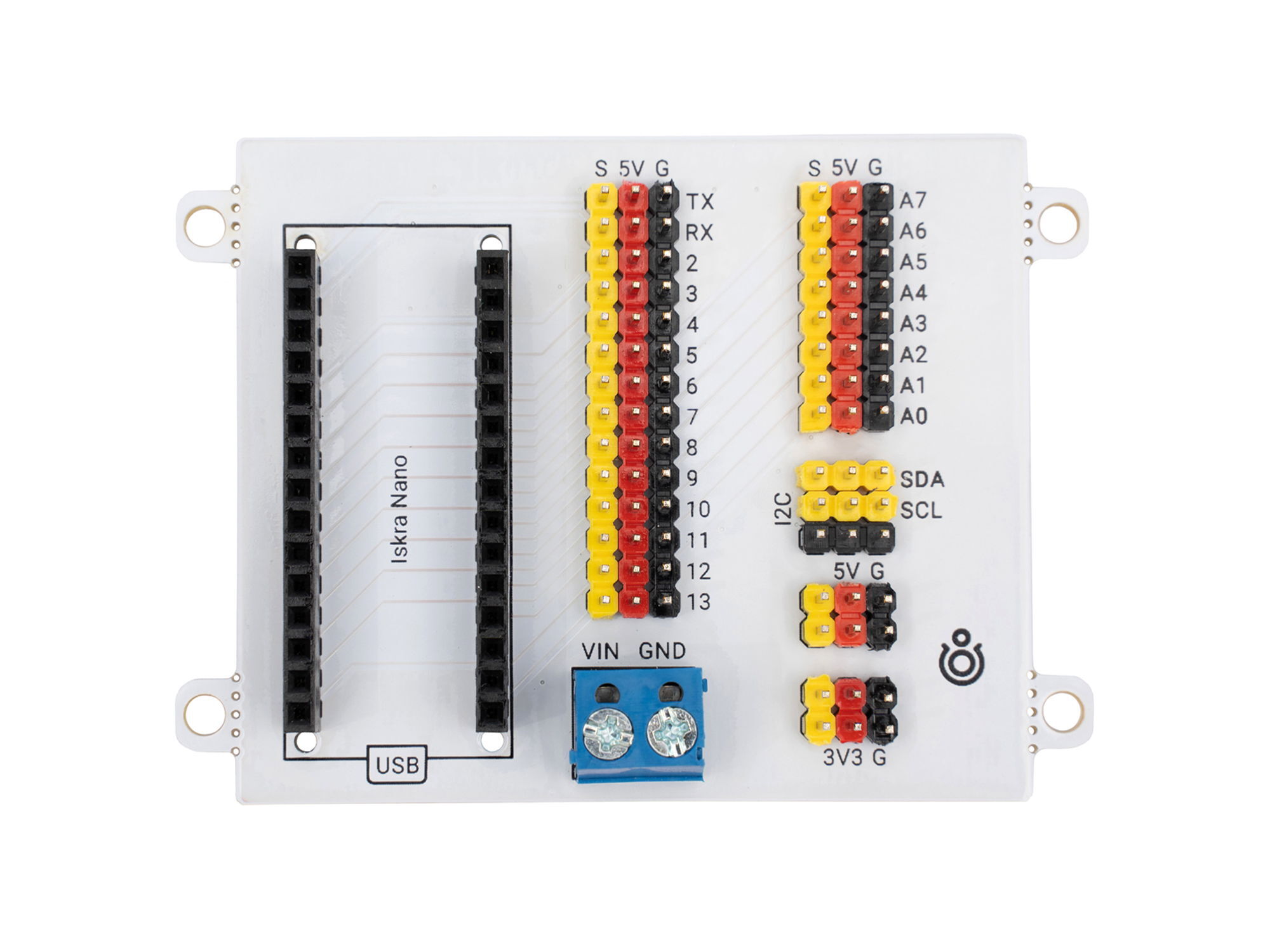 Troyka Nano IO Shield — это плата расширения для платформ форм-фактора Arduino Nano / Iskra Nano, которая упрощает подключение Troyka-модулей через стандартные трёхпроводные шлейфы.С платой Troyka Nano IO Shield вам достаточно просто вставить шлейф от каждого модуля в одну группу из трёх штырьков — и всё готово к работе без необходимости брать в руки паяльник или макетную плату.Troyka Nano IO Shield выполнен в форм-факторе Zelo-модуля, а значит, он надёжно крепится винтами через специальные проушины и не будет дребезжать в корпусе устройства из #Структора.РаспиновкаНа плате Troyka Nano IO Shield выведены группы тройных контактов «S-V-G». Они соединены с линиями управляющей платы следующим образом:Сигнал (S) — соответствующий цифровой или аналоговый пин.Питание (V) — источник рабочего напряжения.Земля (G) — общая земля.Отдельными тройными контактами мы вывели интерфейс I²C с тремя группами SDA/SCL для подключения соответствующих Troyka-модулей.На плате есть клемма для внешнего питания с надёжным подключением под винт. Контактные группы 3V3 и 5V позволяют отдельно запитать периферию с рабочим напряжением 3,3 В или 5 В.Механическая совместимостьTroyka Nano IO Shield подходит для плат формата Arduino Nano, Iskra Nano и их аналогов с 30 контактными ножками.Комплектация1× Плата-модульХарактеристикиСовместимость: Arduino форм-фактора NanoПитание подключаемых модулей: 3,3–5 ВИнтерфейсы Troyka (S-V-G): 22 группы контактовИнтерфейс I²C: 3 группы контактовРазмеры: 75×55×16 ммРесурсыЧто такое Troyka-модули?