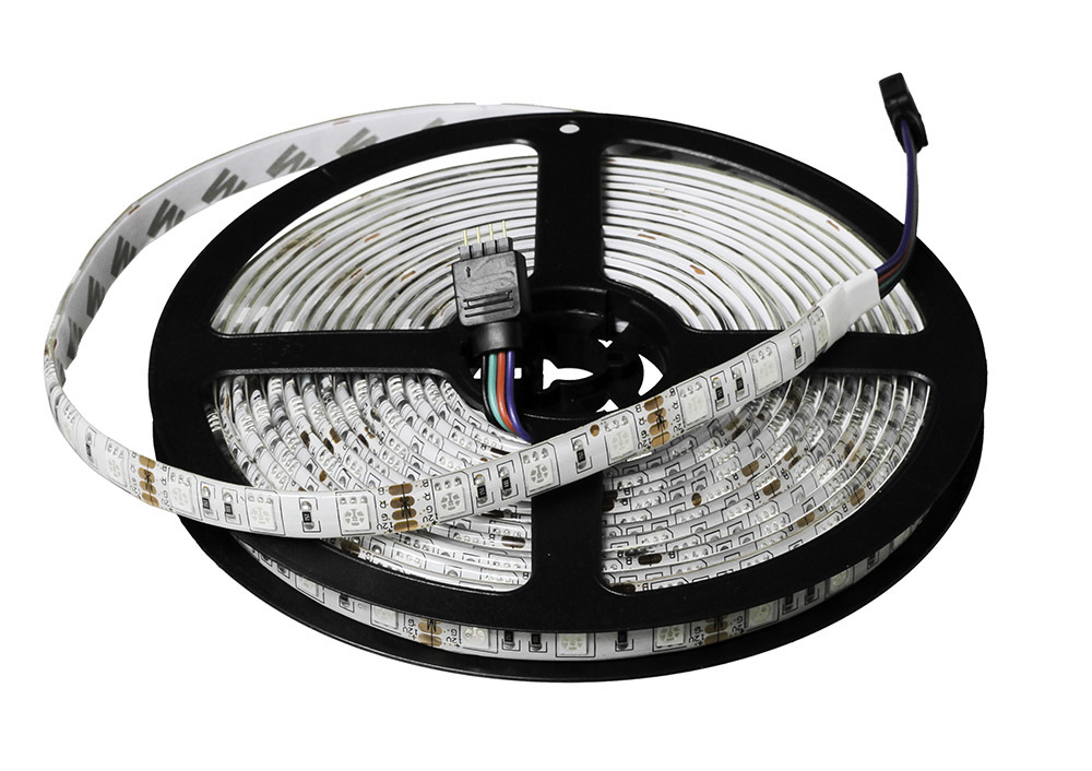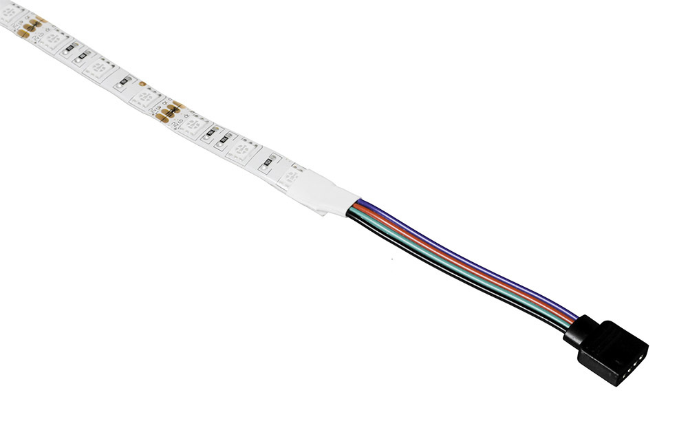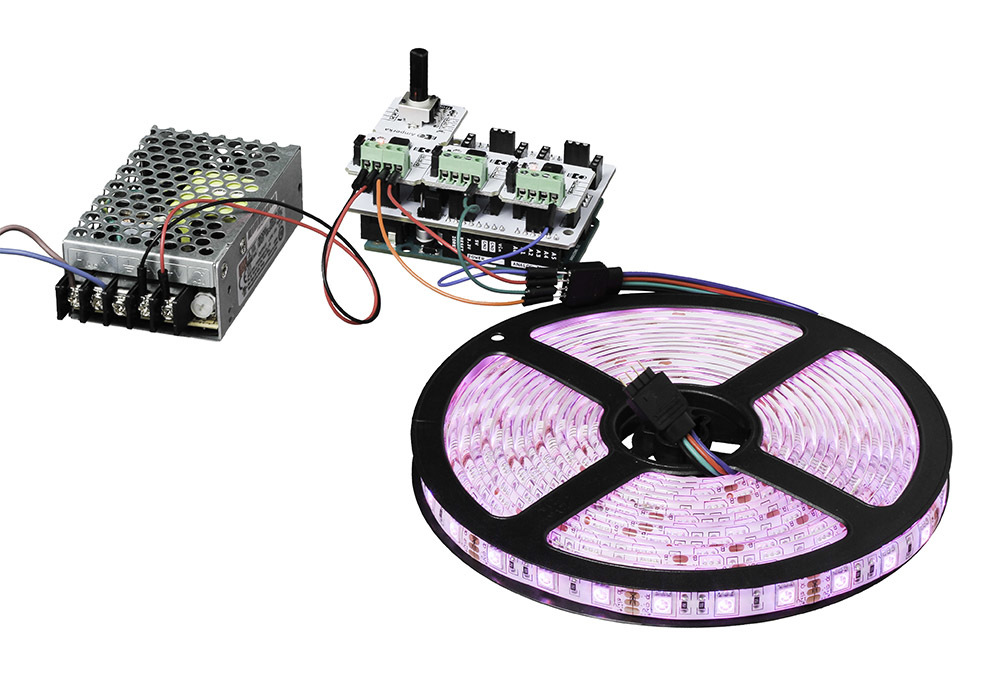 Цветная светодиодная лента украсит интерьер всеми цветами радуги и придаст индивидуальность фасаду типового коттеджа. Класс защиты IP65 надёжно защитит от дождя и снега.На пяти метрах поместилось 300 цветных светодиодов. Светодиоды намного экономичнее любых других источников света, поэтому лента потребляет всего 36 ватт.Для подключения ленты к управляющей платы понадобятся три силовых ключа — по одному на каждый цветовой канал.СекцииЕсли пяти метров для проекта много, можете отрезать кусок нужной длинны. Каждые пять сантиметров на ленте предусмотренны места для разрезания. Найдите пунктирную линию с пиктограмкой ножниц и смело режьте по ней.Хотите украсить фасад дома к Новому Году? Спаяйте несколько лент в длинную гирлянду. И не забудьте отдельно подвести питание к местам стыков лент. Дорожки между светодиодами тонковаты для больших токов, поэтому запитать 30 метров с одного конца не получится — лента сгорит.ПитаниеСветодиодная лента рассчитана на напряжение 12 вольт и потребляет до 3 ампер. При максимальной яркости лента потребляет до 36 ватт.Это важно знать при выборе блока питания. Рекомендуем подобрать источник питания с 20% запасом мощности.ПодключениеНа светодиодной ленте с обоих концов расположено четыре контакта.(+12V) — положительный контакт. Общий для всех трёх цветовых компонентов. Подключите к плюсовой клемме источника напряжения(R) — отрицательный контакт красных светодиодов(G) — отрицательный контакт зелёных светодиодов(B) — отрицательный контакт синих светодиодовПины R, G и B подключаются к управляющей плате через силовые ключи. Если подключить ленту напрямую к контроллеру, плата может сгореть.Для подключения к Arduino или Iskra JS воспользуйтесь Troyka Shield.ПрограммированиеДля подключения к Arduino или Iskra JS пригодится Troyka Shield или Troyka Slot Shield.Для включения и выключения каждого цвета, подавайте высокий или низкий уровень на пин ленты через силовой ключ. Для управления оттенками используйте ШИМ.ХарактеристикиДлина ленты: 5 метровЦвет свечения: RGB, 16 миллионов цветовМодель светодиода: SMD 5050RGBРабочее напряжение: 12 ВПотребляемый ток: 3 А (0,6 A/м)Потребляемая мощность: 36 Вт (7,36 Вт/м)Плотность светодиодов: 60 штук/мКратность резки: 3 светодиодаКласс защиты: IP65РесурсыОбзор LED лент:Руководство по использованию, примеры и документация