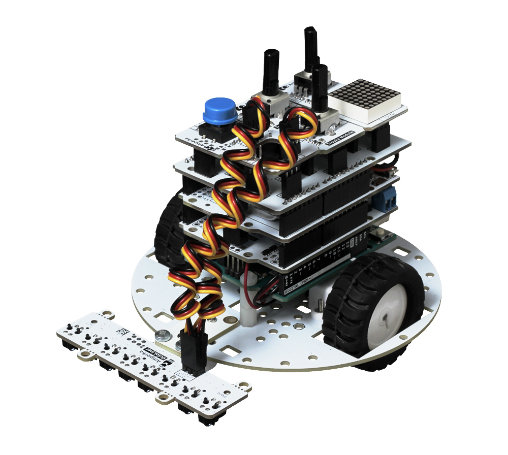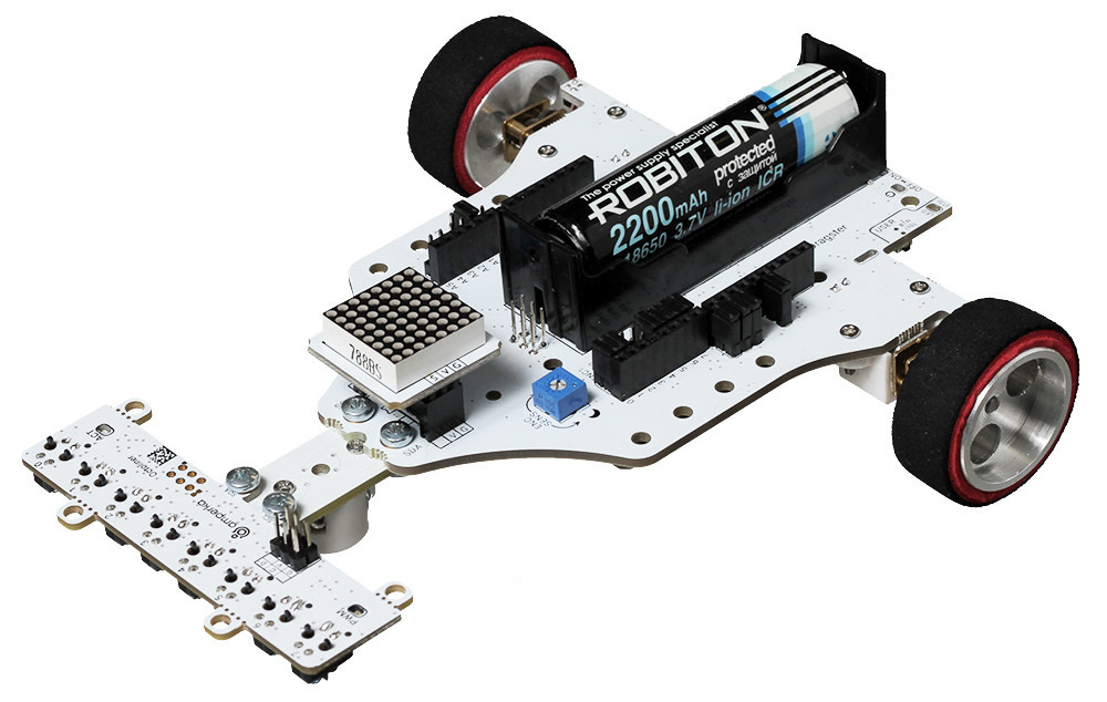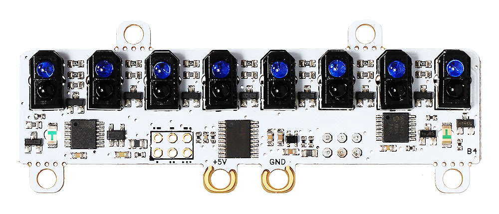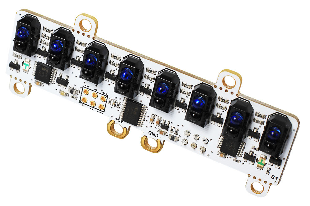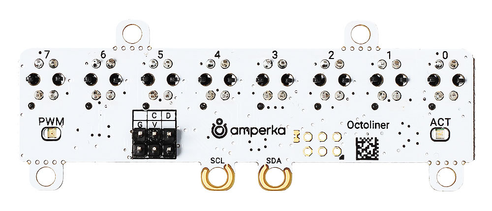 Подготовьте своего робота к гонкам по линии! Установите на мобильную платформу восьмиканальный датчик линии, который поможет вашему боту прийти к финишу первым и не сбиться с пути.В чём фишкаНа борту сенсорной сборки расположены восемь датчиков линии на оптопаре TCRT5000. Каждый сенсор способен отличить все оттенки серого — от белого до чёрного. В результате ваш робот будет лучше держать траекторию и мчаться по чёрной (или белой) линии на контрастном фоне, не теряя скорости.Как это работатетДатчик состоит из двух элементов — светодиода (излучателя) и фототранзистора (приёмника). Когда светодиод излучает инфракрасный свет, световой поток отражается от поверхности и попадает на фототранзистор, где преобразуется в электрический сигнал.Тёмный цвет отражает меньше света, светлый — больше. Используя несколько таких датчиков, робот определяет тёмную линию трассы и следует по ней.Как устроены мозгиДатчики линии подключены к собственному 32-разрядному микроконтроллеру STM32F030F4P6 с вычислительным ядром ARM Cortex-M0. Контроллер собирает данные с восьми датчиков линии и передаёт управляющей платформе по интерфейсу I²C. Интенсивность излучения и чувствительность фотоприемников можно регулировать программно.ПодключениеМодуль подключается к управляющим платам через Troyka-контакты.Сигнальный (D) — линия данных шины I²C (SDA).Сигнальный (C) — линия тактирования шины I²C (SCL).Питание (V) — питание сенсора (3,3–5 В).Земля (G) — общая земля.При подключении к платформам Arduino и Iskra JS удобно использовать плату расширения Troyka Shield. Для одноплатных компьютеров Raspberry Pi подойдёт Troyka HAT.В случае с платформами Uno Slot и Wi-Fi Slot датчик можно прикрутить металлическим крепежом к контактным отверстиям и получить готовое электрическое соединение.ПрограммированиеМодуль программируется в среде Arduino IDE через готовую библиотеку Octoliner, а для Raspberry Pi мы сделали OctolinerPi на Python. С помощью библиотек вы сможете быстро настроить чувствительность сенсора и приступить к считыванию данных.Комплектация1× Сенсорная сборка2× Трёхпроводной шлейфХарактеристикиМодель: Amperka Octoliner v2 (AMP-B133)Количество каналов: 8Чувствительные элементы: оптопары TCRT5000Микроконтроллер: STM32F030F4P6Интерфейс: I²CЧастота опроса: 190 Гц (8-канальный режим)Напряжение питания: 3,3–5 ВПотребляемый ток: до 87 мАРазмеры: 80×30×16 ммРесурсыВидеообзор Octoliner:Инструкция, примеры использования и документацияБиблиотека для ArduinoБиблиотека для Raspberry Pi