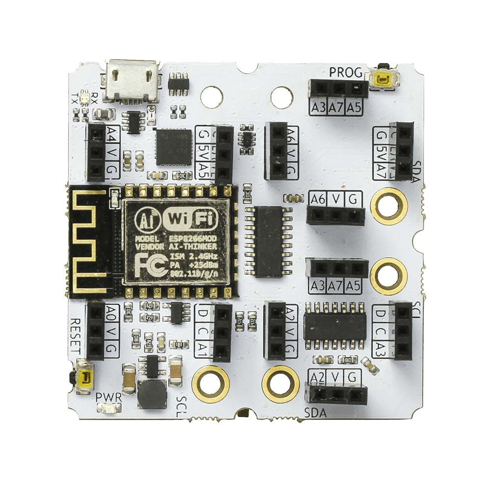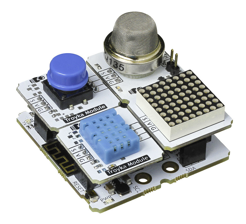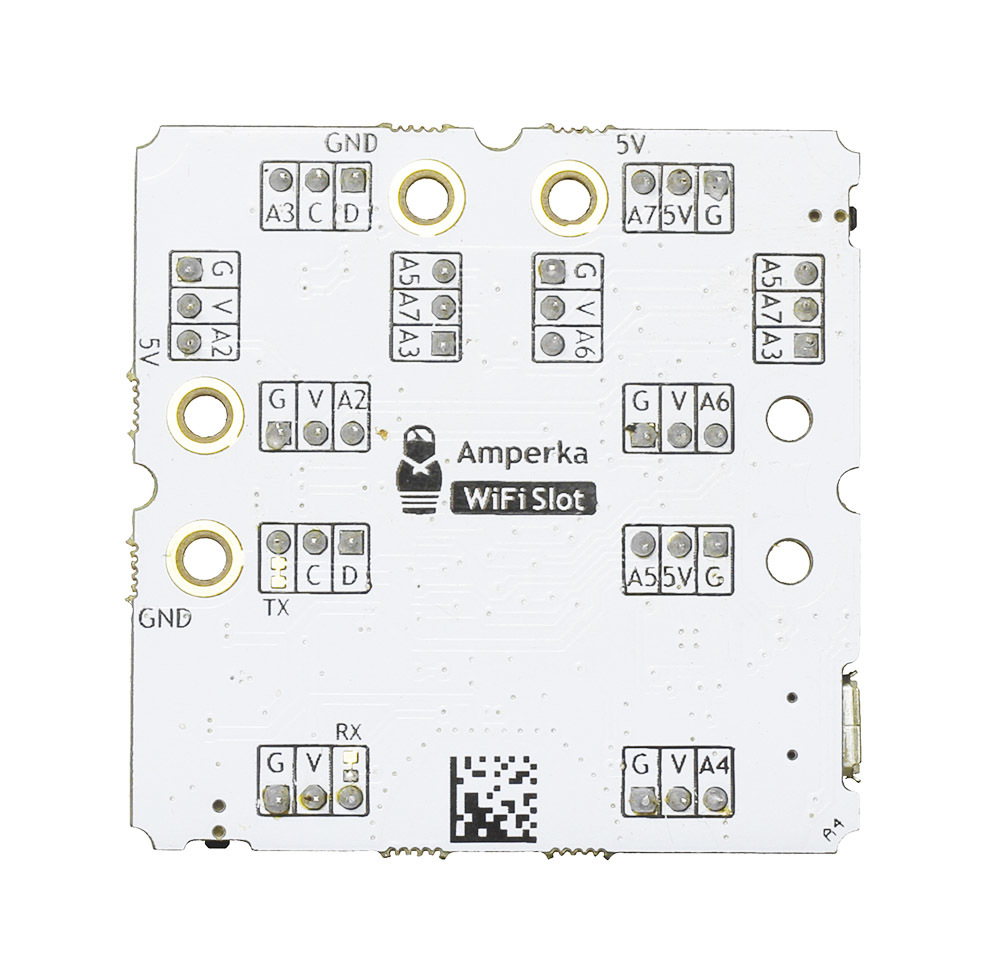 Собирайте компактные устройства с Wi-Fi на борту. Платформа Wi-Fi Slot поможет быстро и аккуратно собрать умный датчик или исполнительный механизм интернета вещей. Или диджейский пульт. Или панель управления мобильным роботом. Плата программируется на C++ и JavaScript — пишите код на том, что по душе!Особенности платыНа борту платы мы собрали всё для быстрого и комфортного старта: модуль ESP12 с чипом ESP8266EX, USB-разъём для программирования и отладки, понижающий преобразователь DC-DC с выходным током до 1 A, 10 пинов ввода-вывода с поддержкой ШИМ-сигнала и две программные кнопки.Чип ESP8266EX поддерживает только один аналоговый вход с напряжением до 1 вольта. Мы добавили на плату восьмиканальный аналоговый мультиплексор в паре с микросхемой селектора каналов АЦП, а для согласования уровней — резисторный делитель. Поэтому Wi-Fi Slot может одновременно работать с восемью аналоговыми датчиками и сигнальным напряжением до 3,3 В.Мы упростили и перепрошивку ESP-шки. Забудьте о квестах с нажатиями кнопок при каждой прошивке. Схема автоматического перевода модуля в режим программирования возьмёт его на себя.СборкаПлата позволяет подключить до четырёх Troyka-модулей без пайки, проводов и изоленты. Если и этого мало, подключите плату расширения Slot Expander. Один Wi-Fi Slot потянет больше ста таких плат.ПрограммированиеWi-Fi Slot придётся по вкусу как бородатым электронщикам, так и Web-программистам. Плата программируется на С++ через Arduino IDE и JavaScript через Espruino Web IDE. Также доступна визуальная среда разработки XOD IDE.ПроизводительностьWi-Fi Slot основан на модуле ESP-12 с чипом ESP8266EX. Чип выполнен по технологии SoC (от английского System-on-a-Chip — система на кристалле). Сердце устройства — 32-битный процессор Xtensa Tensilica L106 с частой 80 МГц с ультранизким энергопотреблением, радиочастотный трансивер с физическим уровнем Wi-Fi IEEE 802.11 b/g и блоки памяти SRAM. Мощности процессорного ядра хватает для работы сложных пользовательских приложений и цифровой обработки сигналов.Порты ввода-выводаНа плате мы предусмотрели десять портов ввода-вывода с поддержкой ШИМ. Восемь из них рассчитаны на работу с аналоговыми сенсорами.ПитаниеПитание подключается через разъём micro-USB, рассчитанный на 5 вольт. В качестве источника напряжения может быть компьютер или сетевой адаптер. Если хотите использовать более высокое напряжение, воспользуйтесь DC/DC-преобразователем от драйвера светодиодных лент. А собрать компактное устройство с автономным питанием поможет Power Cell.На борту платформы вы найдёте две линии питания:5V — линия питания 5 вольт через разъём micro-USB.V — линия питания 3,3 вольта понижающего преобразователя DC-DC.GND — общая земля.Комплектация1× Плата Wi-Fi SlotХарактеристикиМодуль: ESP-12 (ESP8266)Тактовая частота: 80 МГцОбъём Flash-памяти: 2 МББеспроводной интерфейс: Wi-Fi 802.11 b/g 2,4 ГГцРежимы работы: клиент (STA), точка доступа (AP), клиент + точка доступа (STA + AP)Порты ввода-вывода общего назначения: 10Порты с АЦП: 8Разрядность АЦП: 10 битПорты с ШИМ: 10Разрядность ШИМ: 8/10/12 бит (по умолчанию 10 бит)Аппаратный интерфейс SPI: 1Программный интерфейс I²C / TWI: 1Аппаратный интерфейс UART / Serial: 2Номинальное рабочее напряжение: 3,3 ВМаксимальный ток с шины 3.3V: 1 А (включая питание микроконтроллера)Максимальный ток с пина или на пин: 12 мАГабариты: 51×51 ммРесурсыОбзор платформы:Руководство по использованию, примеры и документацияПодробнее о платформах Troyka Slot