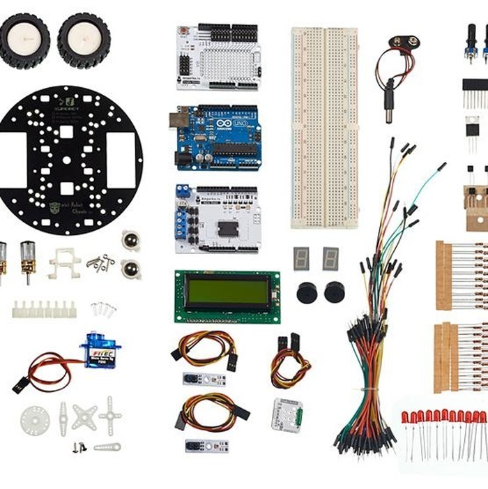 В практичной пластиковой коробке вы найдете всё необходимое для прохождения всех глав учебника: от базовых электронных компонентов вроде резисторов, светодиодов и транзисторов до моторов, сенсоров, LCD-экрана и мобильной платформы для построения роботов.