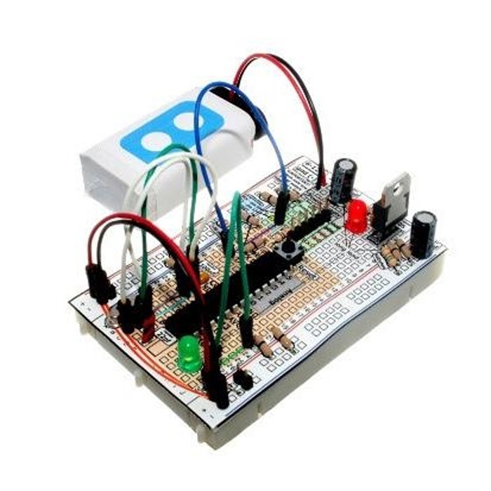 А ещё в набор входят макетные доски (breadboard) и макетные провода. Они позволяют собирать любые электрические цепи за считанные минуты без всякой пайки. Компоненты просто вставляются в отверстия с защёлками и соединяются проводами.